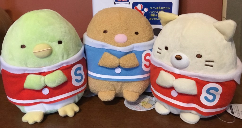 It’s ironic that these were such relatively easy wins, because they are among the most darling plush I’ve seen in a while. They are perfect! Each one measures about 6 inches — a bit more, actually — and feels soft. They’re well made and on the squishy side as opposed to the more stuffed side. I won Tonkatsu, Neko, and Penguin?, but the series includes Tokage and Shirokuma as well.