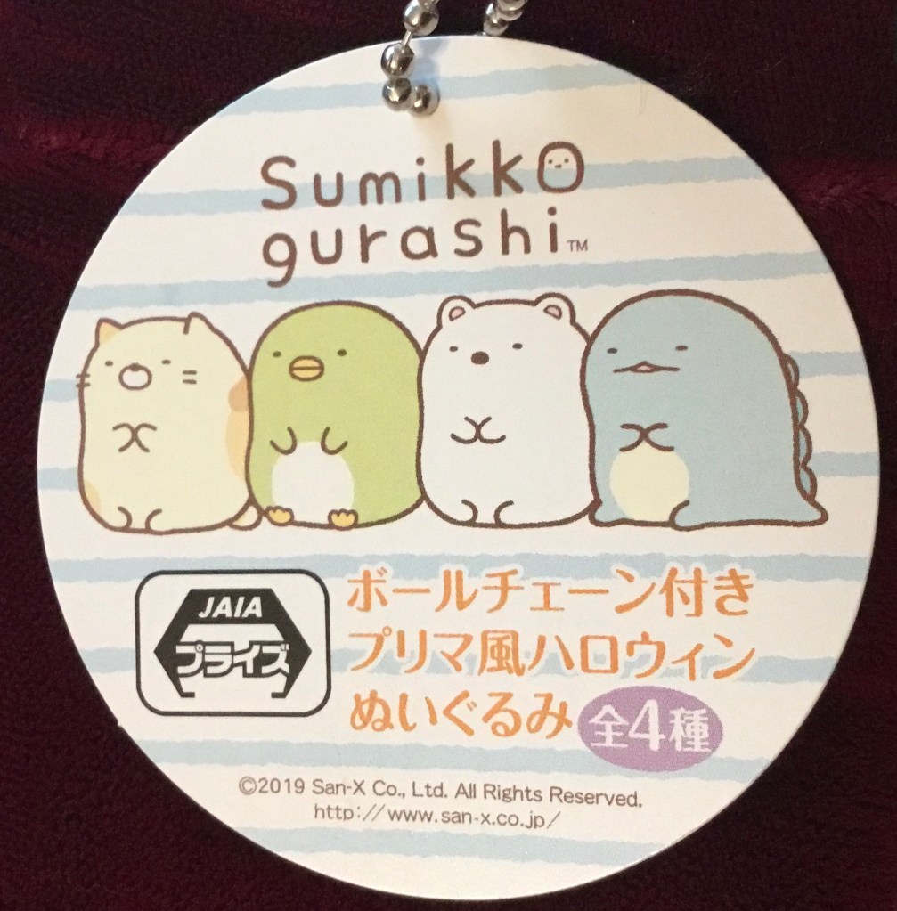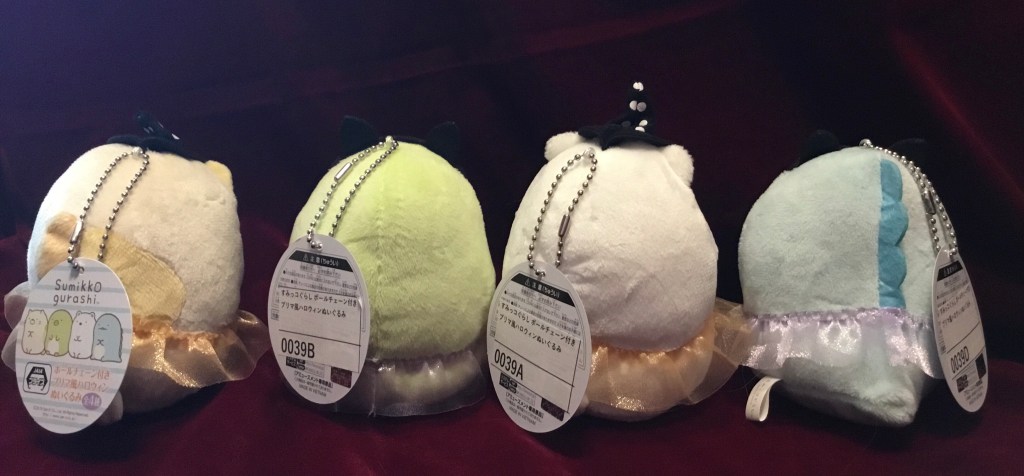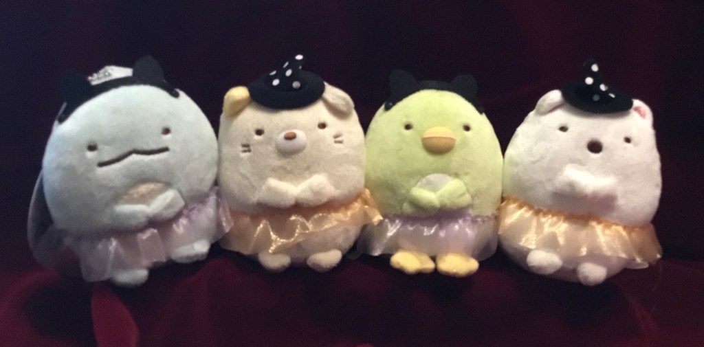 These are the four plushies in the Sumikko Gurashi set ボールチェーン付きプリマ風ハロウィンぬいぐるみ、which translates to basically “ballerina skirt Halloween plush with ball chain.” Each measures a bit more than four inches, depending on where you start measuring. I won all four of them on Tokyo Catch more or less one after the other. This came along with the previous order I’d mentioned in past entries, shipped well and quickly and everything like that.