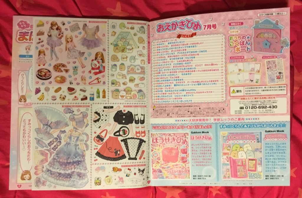 It’s called Oekaki Hime, but I take it it’s using oekaki in a very general sense, because this isn’t really a drawing magazine. You can see this reflected in the very first thing you see once you open it up: four nice sets of stickers, one of Licca-chan, one of Sumikko Gurashi with the camp/otter theme, and two that are clothes-changing stickers for paper dolls called Nakayoshi Princess Rara x Sara. (By the way, I don’t know if these are characters that appear in other media, but be careful if you google the title—it kept pulling up an x-rated film and my sleep-deprived self almost linked to it without checking.)