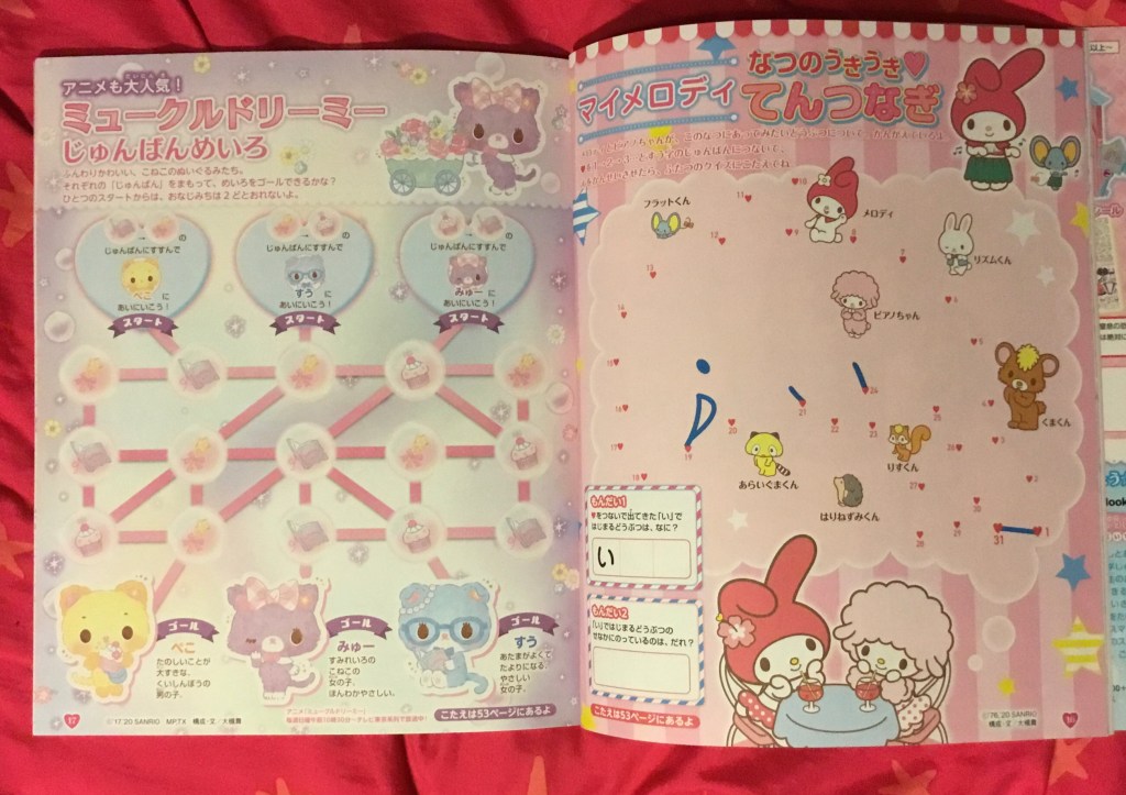 There’s more emphasis on Sanrio than in Pucchigumi too. There are activities and features related to My Melody, Hello Kitty, and Mewkledreamy, as well as Pom Pom Purin, Cinnamoroll, Kero Kero Keroppi and more among the included cut-out postcards.