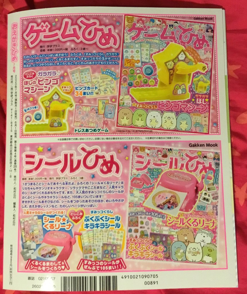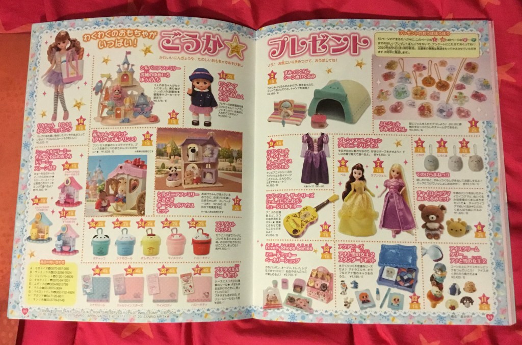 As I’ve written about before, the line between ads and other content is pretty blurry in these magazines compared to their American equivalents, but of course I find this delightful despite it teasing me yet again with the Licca-chan Shopping Park, which I’m seriously worried I’m going to have to buy when shipping isn’t so crazy. The reader giveaways in the picture below are great as usual, too, even if the Rapunzel guitar reminds me how much money I wasted winning what is pretty much the same exact toy with a Sumikko Gurashi theme on Toreba. That Sylvanian Families amusement park is sweet as well.