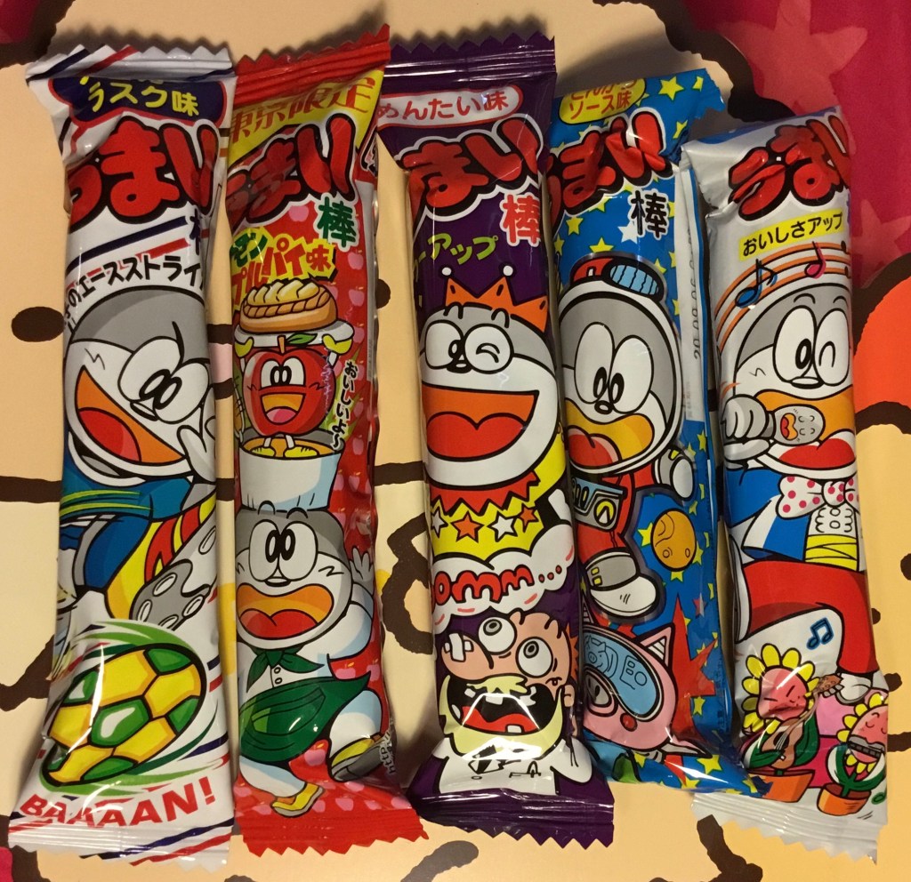 Umaibou is written うまい棒, where うまい umai means delicious and 棒 bou means stick. Pretty appropriate name! Their mascot, Umaemon, has a name that is based on Doraemon and looks a whole lot like him. A lot. A lot. I, uh, might have thought he was Doraemon for a long time. Putting that aside, let’s get to these five Umaibou!