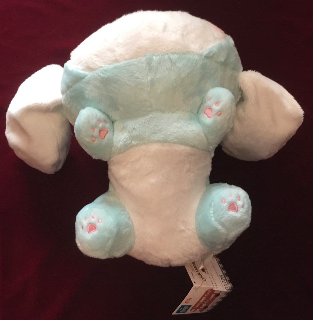 With plush it’s often difficult to describe their quality other than softness or pile or tightness of seams, but there’s a real comment to be made here about just how cutely Cinnamon is stuffed. This shows most in the way the stuffing in his ears makes them extra floppy—which is so in character for him, isn’t it? It also shows through in how easy it is to position the plush sort of upward on his butt in case you don’t want to display him totally flat—this works due to extra stuffing in the rear part.