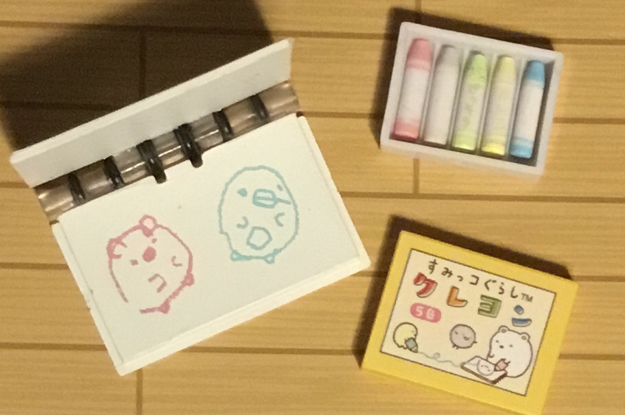 The second set, luckily, had some surprises in the opposite direction. I was pretty pleased with the items in Set Two: What Shall I Draw Today? from the start. The Shirokuma bookshelf is cute, the crayons are extra darling, and while I had to put stickers on the smaller objects, even I managed to do so without too much difficulty.