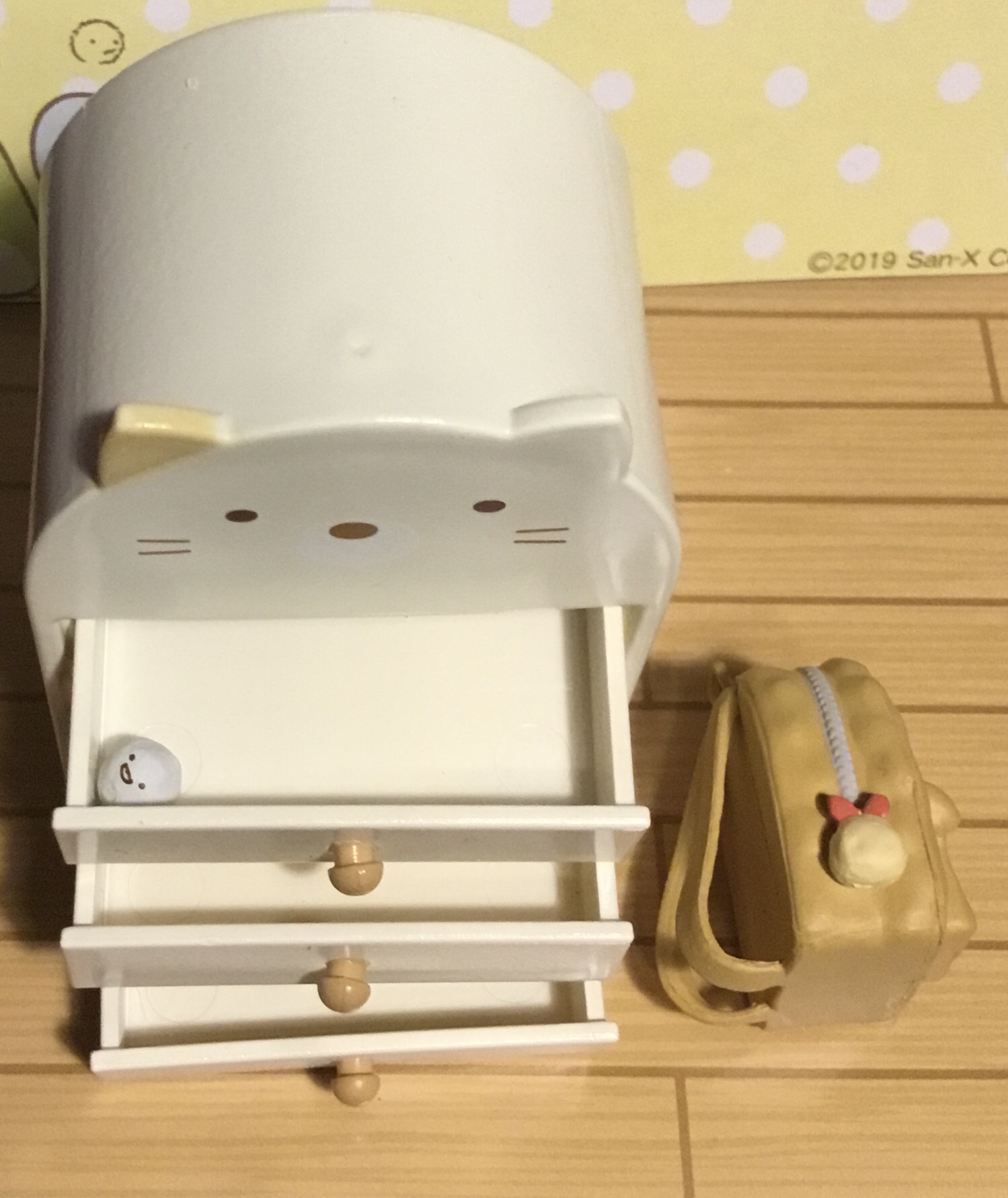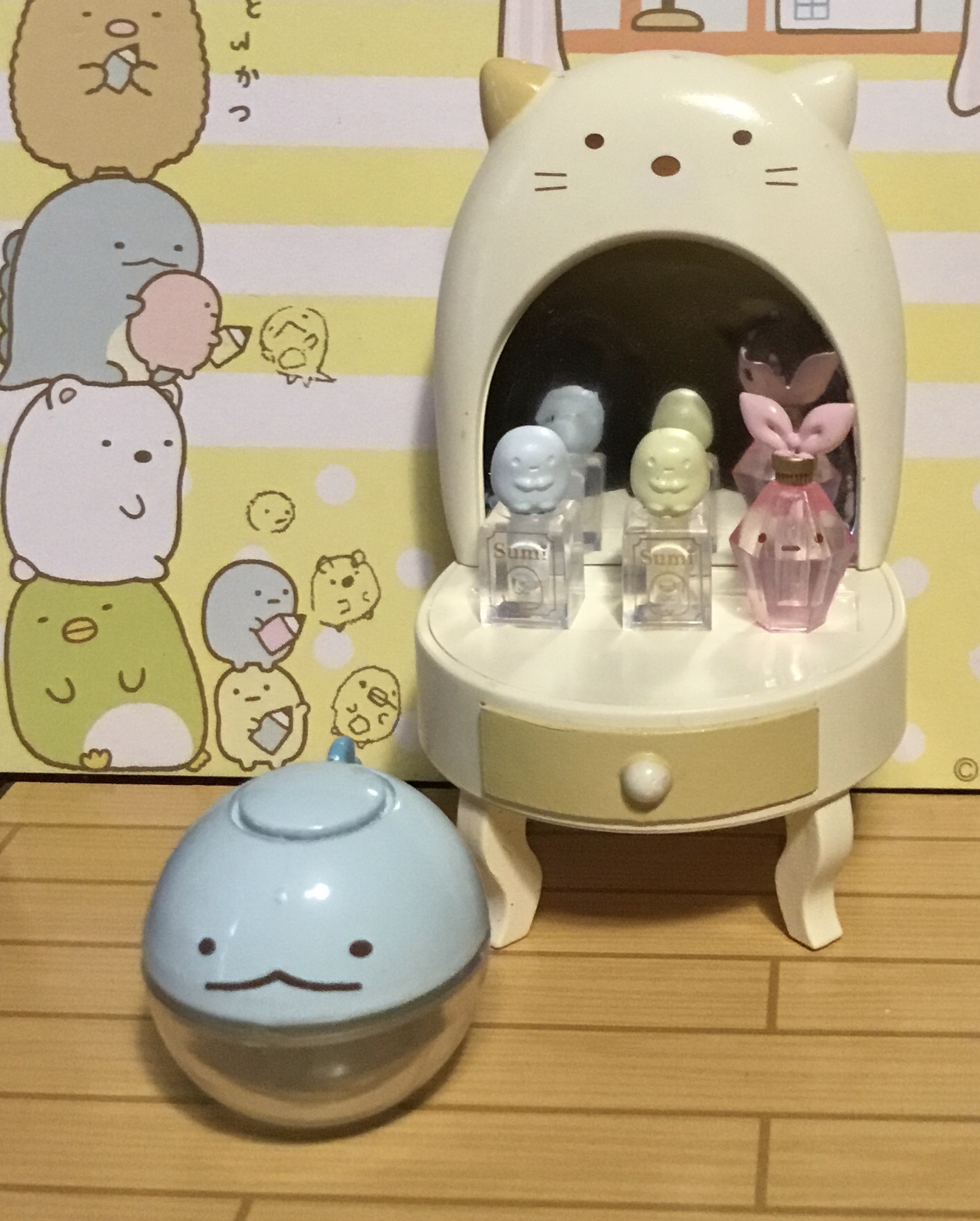 Up next we have Set Three: I’d Love This Dresser….hm. This one is rather a mixed bag. First we have the dresser itself and its mirror surface sticker I couldn’t prevent from being weird and bubbly, plus the fact that the drawer doesn’t open, even though I really thought it would. But on the other hand, the Tokage humidifier is really dear and unique and the bottles are pretty cute, so I’ll come out slightly positive here.