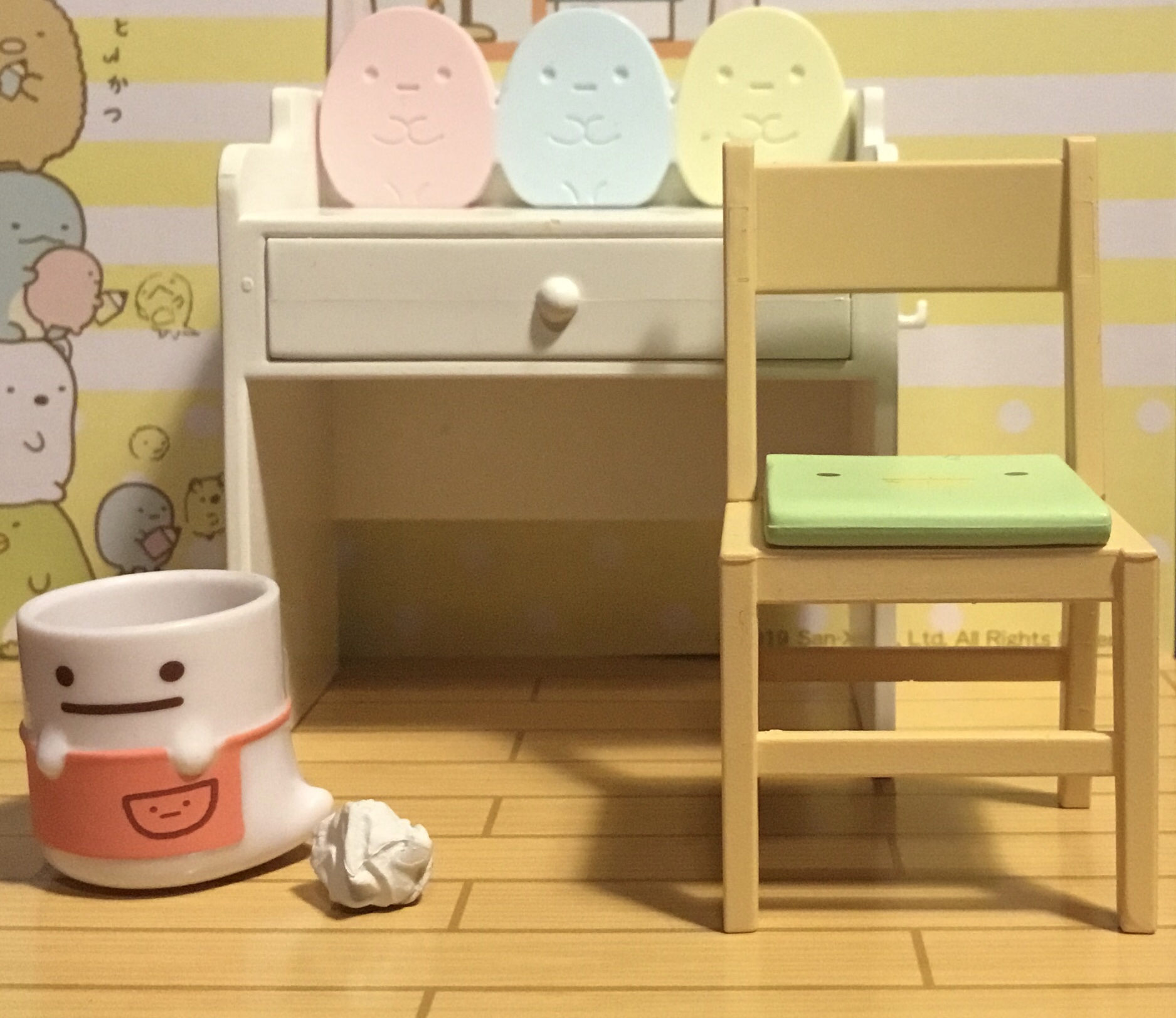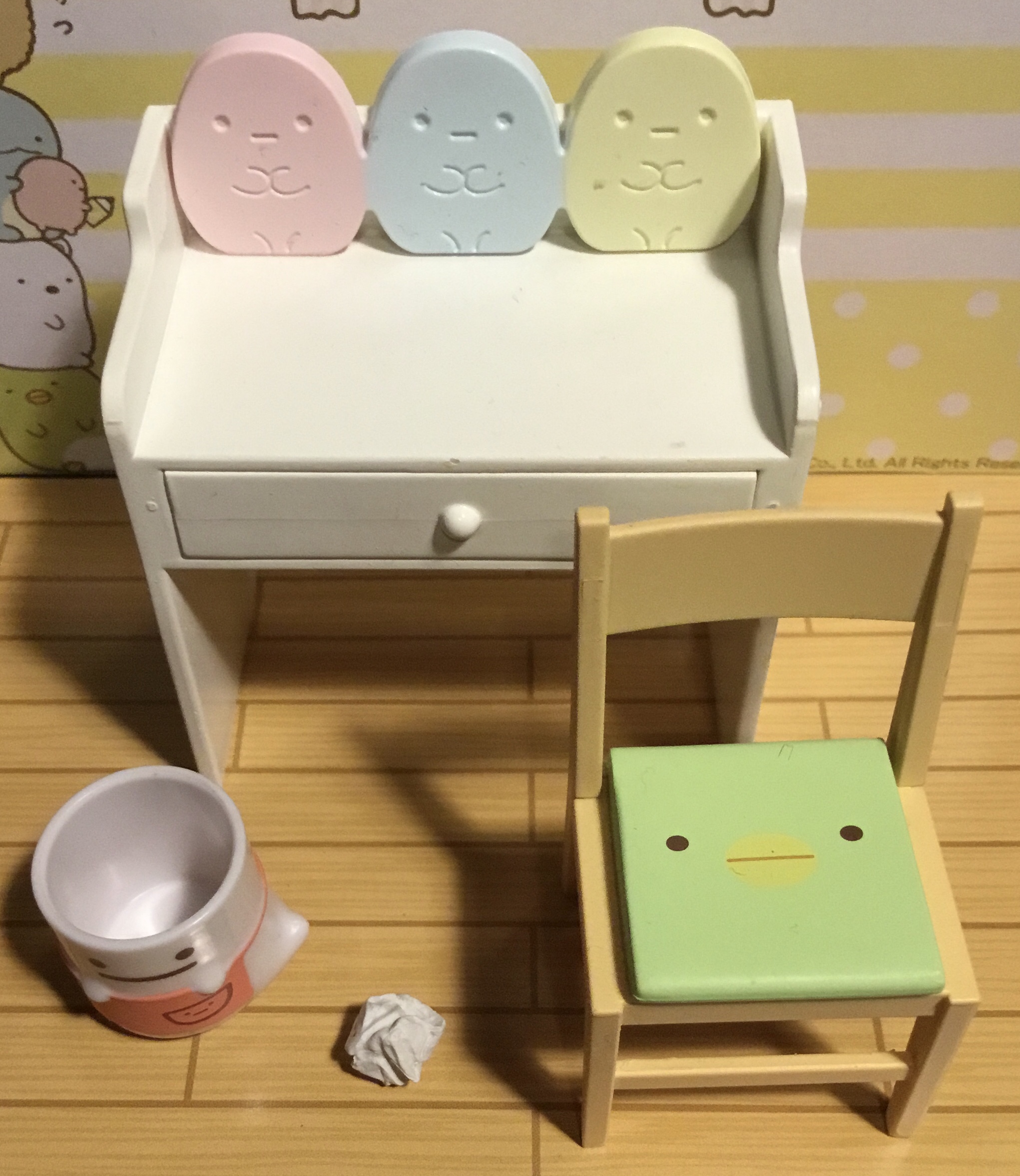 Fourth is Set Four: Sometimes I Must Study and it’s pretty pleasing throughout. I mean, I don’t like that the Tapioca desk doesn’t have a drawer than opens, but you can’t beat it for cuteness, and I’m really looking forward to using the Penguin? chair and especially the Obake trash can in display stuff. I’m honestly rather surprised that the trash for the trash can wasn’t given a Sumikko face. Especially with our cat, wadded-up paper is one of the most common things in our house’s corners! That notwithstanding, it’s still a very nice set.