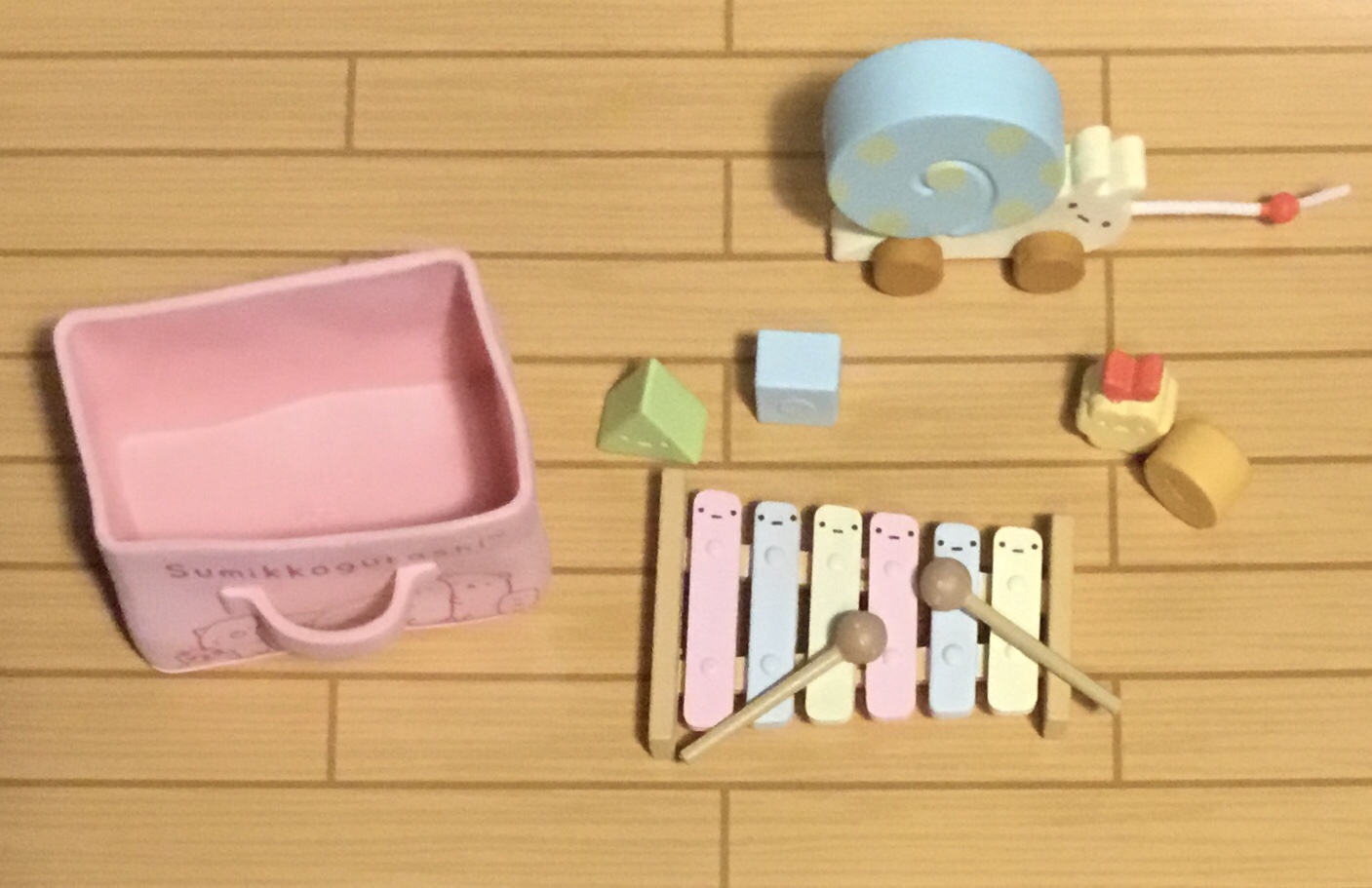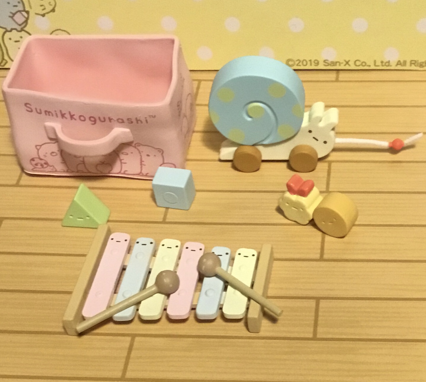 Luckily, it’s one of the very best in the collection. I’m predictably delighted by the Tonkatsu and Ebi Furai no Shippo blocks; I really like the detailed mallets for the xylophone and the xylophone in general; and, while the pink box is a little lopsided, that’s really common with this type of box in full size reality. I also think the Nisetsumuri pull toy is just awesome. And of course I’m impressed that I didn’t really have to do any cutting or constructing for this part!