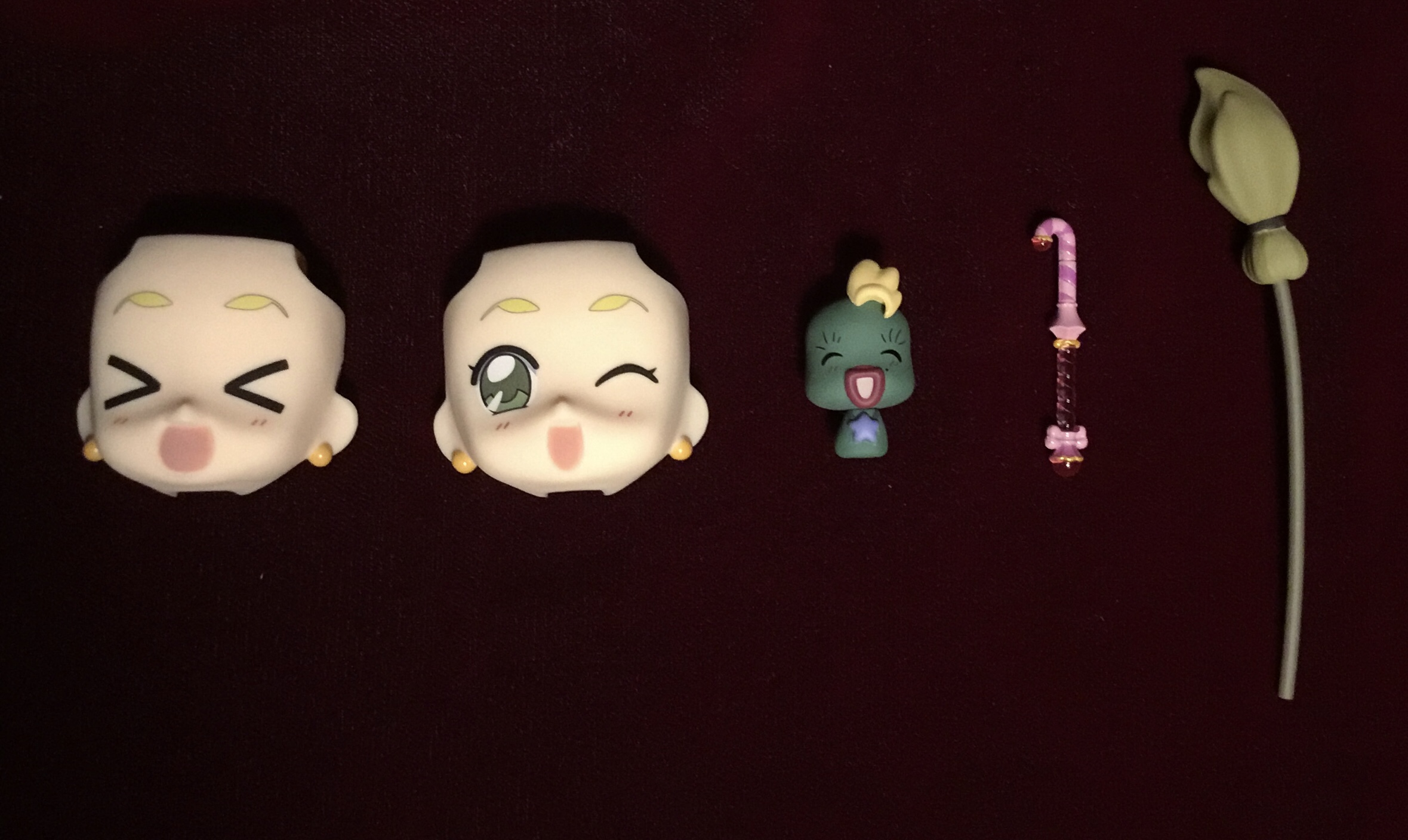 I love the way her personality comes through, but really I was happy that this was the last Nendoroid in the set. Nendoroid figures aren’t always all that easy to get all parts to go together nicely, and honestly I was just baffled about how they designed the stand part that goes on the back here to hit the girls just at their waist, so that I can get them balanced on their brooms, but it’s extremely stressful, and I’m probably going to curse a lot. Momoko was actually significantly easier to get posed than poor Hadzuki and especially Onpu, though, for the record.