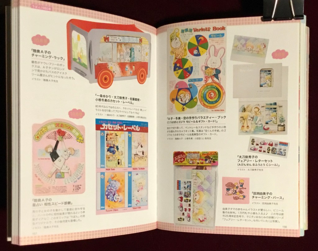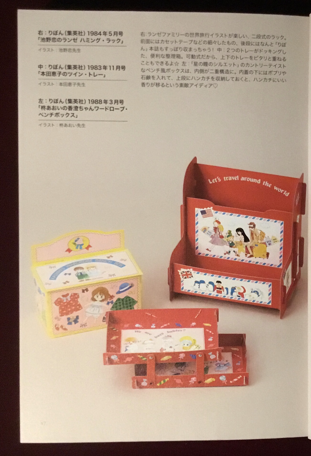 The book starts off with examples via type of furoku — stationery, playing cards, calendars, bags, and so forth. In the picture below, as one example, we have a selection of buildable crafts. Starting on the left, there’s a Wardrobe Bench Box from the March 1988 issue of Ribon done by Aoi Hiiragi, who I know because she did the manga on which the Studio Ghibli film Mimi wo Sumaseba (Whisper of the Heart) was based.