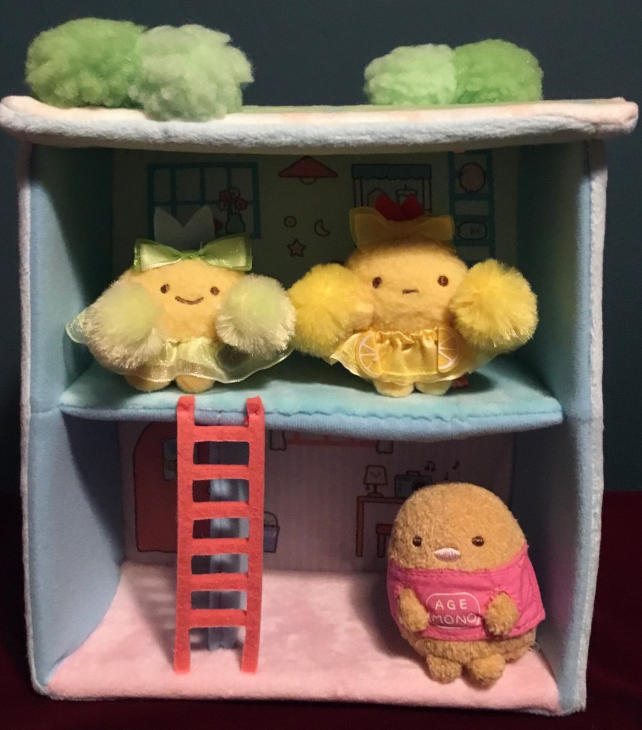 Look at what I got from amiami (for less than $22, pretty much a bargain when I consider this is both adorable and a great way to display some tenori plush) — the Sumikko House with Garden Terrace! Now that I figure Tonkatsu is more or less Ebi Furai no Shippo and Aji Furai no Shippo’s adoptive Meat Dad, it stands to reason he needs a little corner-y house of his own. So they’re moving in.