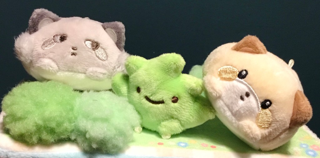 I also found myself unable to resist these two nigichoco plush — the にぎnigi part is from 握る nigiru, to grasp or hold, since these are just made to fit in your hand. The choco I am not so sure about, but I feel like it’s just referring to the fact that they’re little, a mix of 小 which can be read cho* and 子 ko, which means a child or a little guy in the general sense, so these are cute little guys that fit in your hand. That’s my best guess, at least.