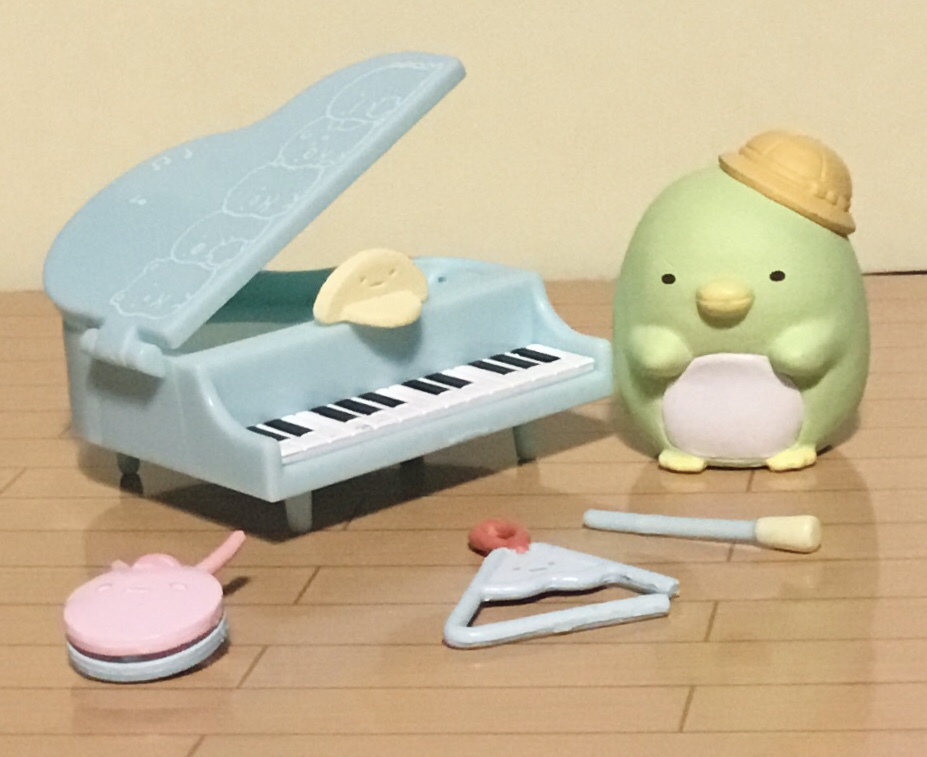 Set Two is called Recital Time. (That’s the best translation I can think of for oyuugi here — I tend to think of it as like a musical performance.) No matter what you call it, this is a top favorite set for me. I love pianos, especially cute and toy pianos, and this combines one with castanets, a triangle and rod, and everyone’s favorite totally-not-a-kappa-just-a-regular-penguin Penguin?. I love every single one of those things!