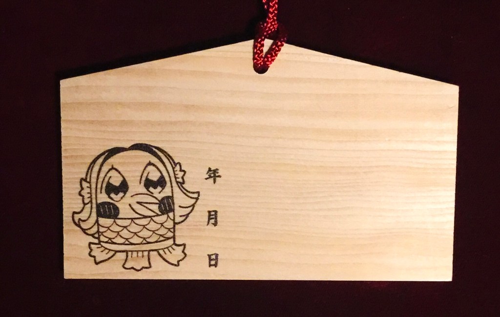 It’s typical ema size, about three inches high and five inches wide, it’s made of decently thick wood, and it is a bargain at about $6.50. The black text on the right says 疫病退散 ekibou taisan (Plague begone). The lighter text just to the left of that says the youkai’s name アマビエ Amabie. On the back, below, there’s a place to write year, month and day.
