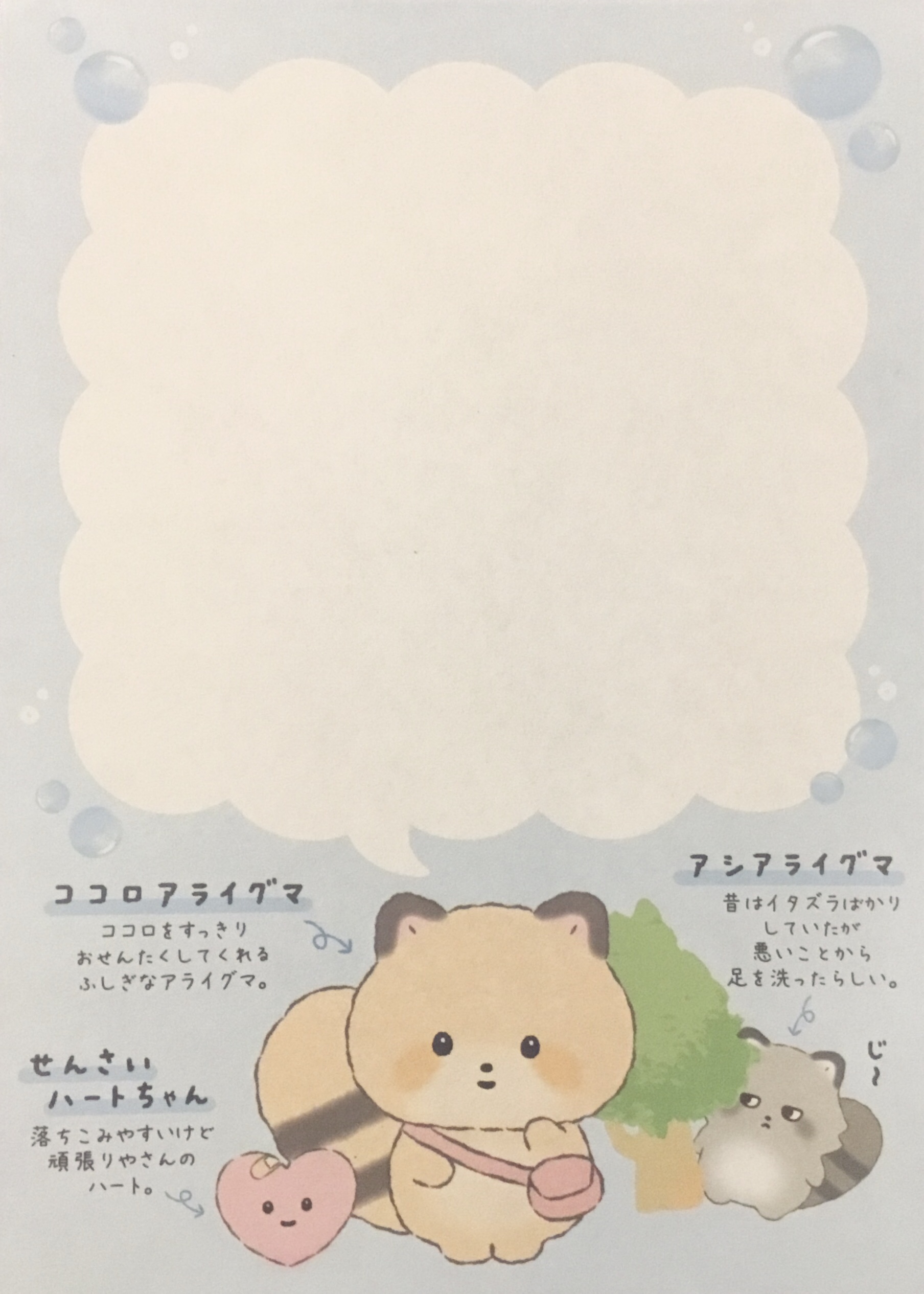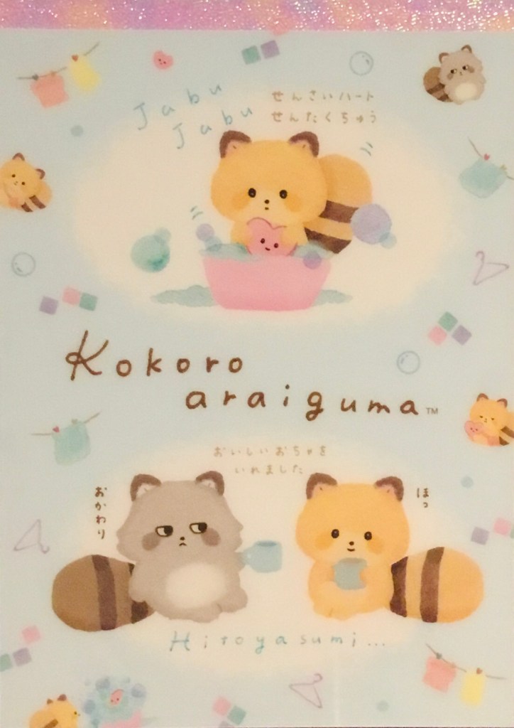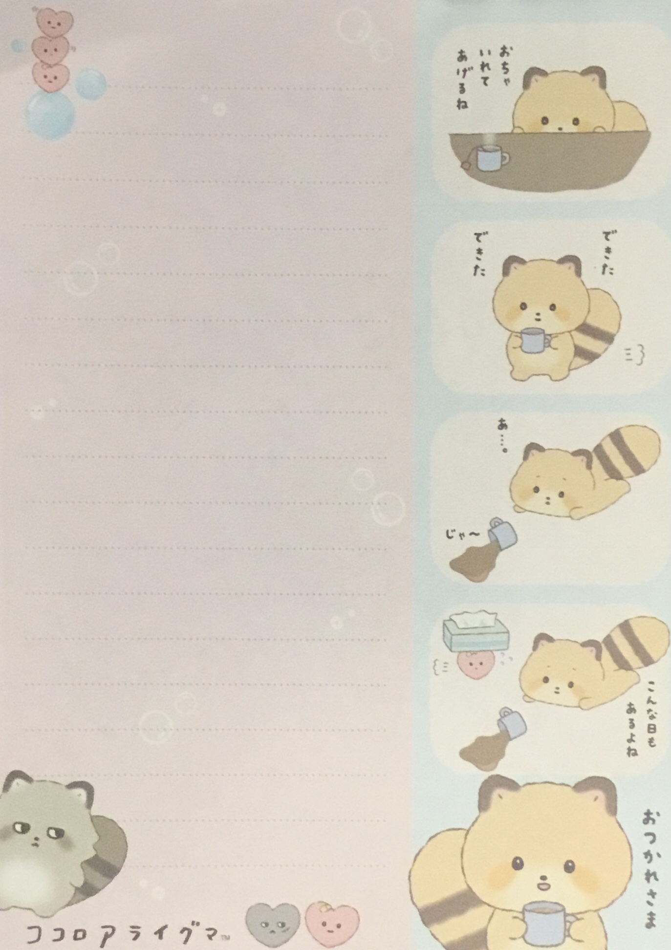 I can’t really imagine a scenario in which I wouldn’t like Kokoroaraiguma goods. On my last amiami order, I managed to pick up these two notepads (about six inches high and four inches wide) and am so pleased with them I just mostly wanted to show how cute they are, with a bit of translation here and there.