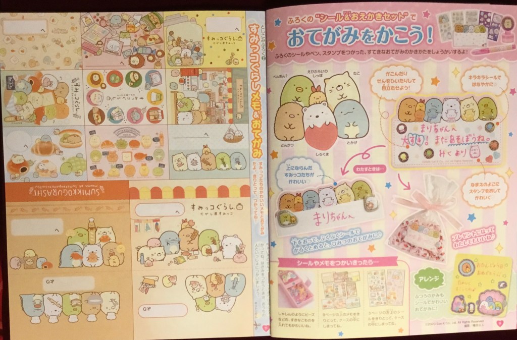 Inside, the contents are fairly typical, compared to what we found the last time we went over an issue, with a lot of Sumikko Gurashi content — nicely spanning across different designs, including my favorites Bread Class and Dagashiya, so that’s pretty great. Below we have little papers and advice on making cute letters: