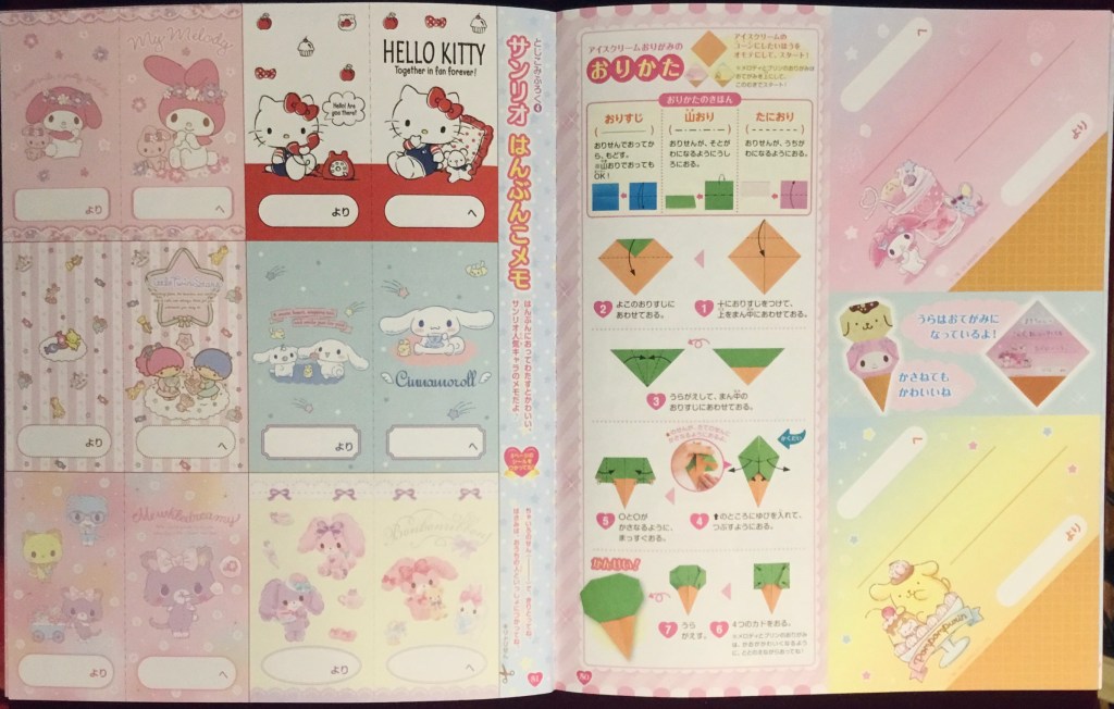 I was also pleased by the breadth of Sanrio characters and designs, including the Hello Kitty designs that make me extra nostalgic for those from my childhood, and Mewkledreamy, which I’m fond of even if I’ve never watched the anime series. On the right, there’s a papercraft project to make little ice cream cones.