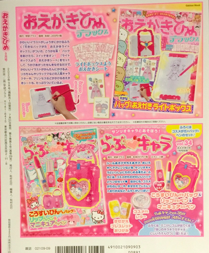 To wrap things up, the back cover has furoku info for some related publications. Up above is the November Oekaki Hime, branded as Deluxe no less, which comes with a light box and costs about $11.50; below is a Sanrio-heavy Love Chara Vol. 34, with furoku of Sanrio-cosmetics-themed stationery including a pen, marker, bag and memo pad, at about $8.50.