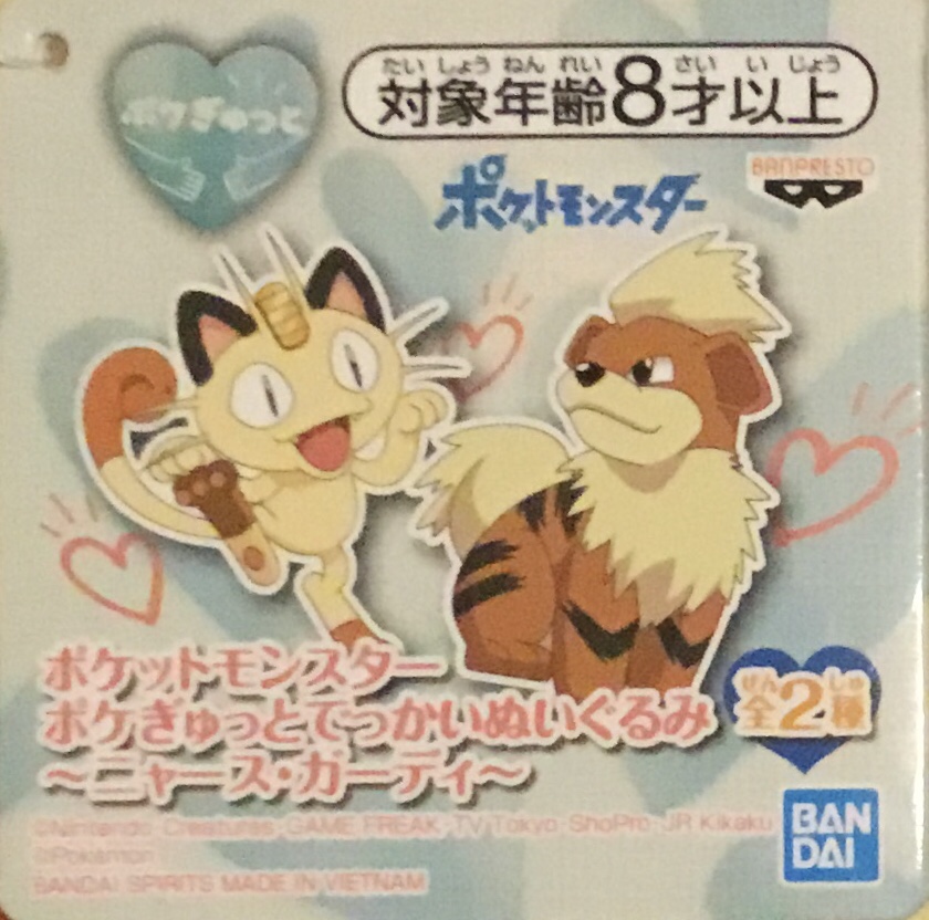 This plush is similar, down to its size and Nyaasu again being paired up with Gardie, to the last one. It’s from a line called Poke Gyutto, where ぎゅっと gyutto can be used for “tightly,” like a hug — I’m going to call it Pokesqueeze.