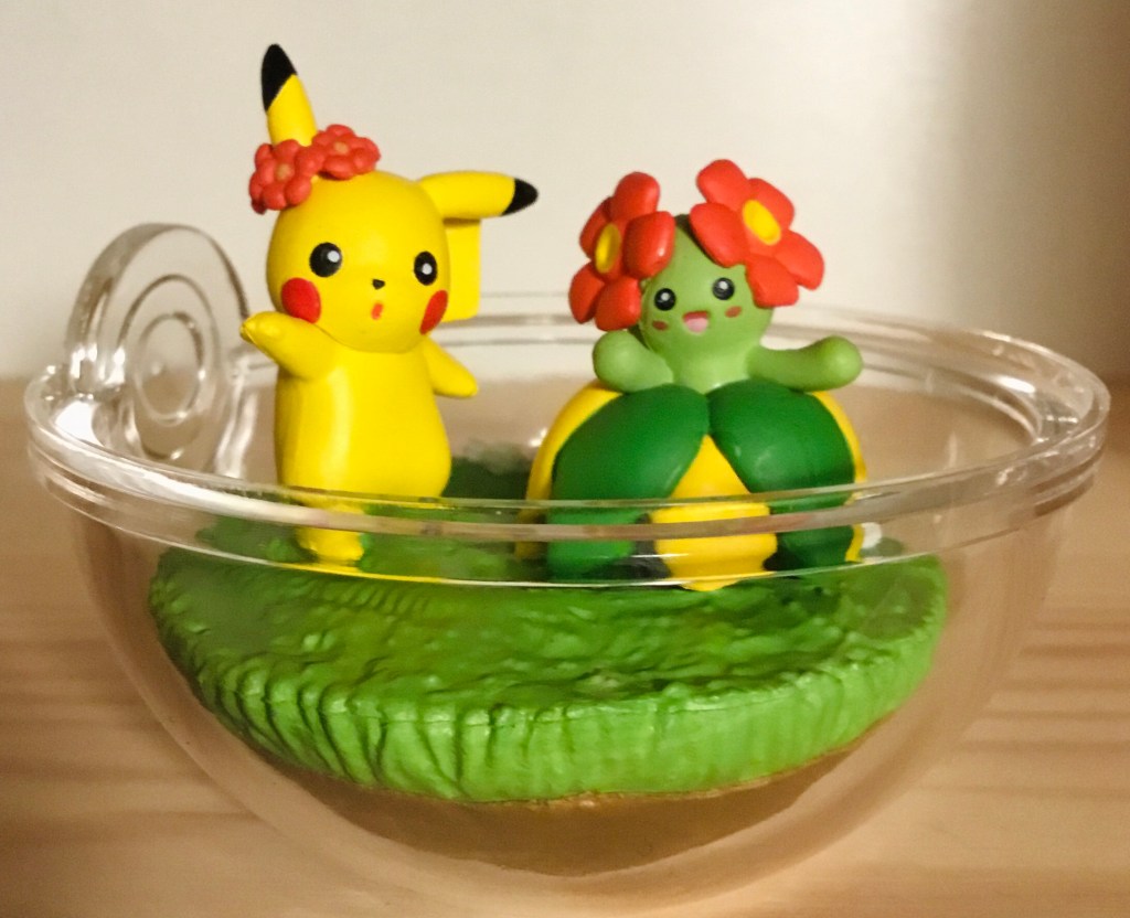 Things get off to an exceptionally nice start with this first terrarium featuring Pikachu and Kireihana/Bellossom. The facial expressions are so cute, and I liked slipping the little ring of flowers over Pikachu’s ear. Bellossom is a pretty direct translation for Kireihana, where the Bel comes from words like the French belle or Spanish bella, with the same meaning as きれい kirei, pretty. Then the rest of the name — Bellossom overall, as a reference to blossom, or 花 hana, flower — just points to this Pokemon’s cute and flowery appearance.
