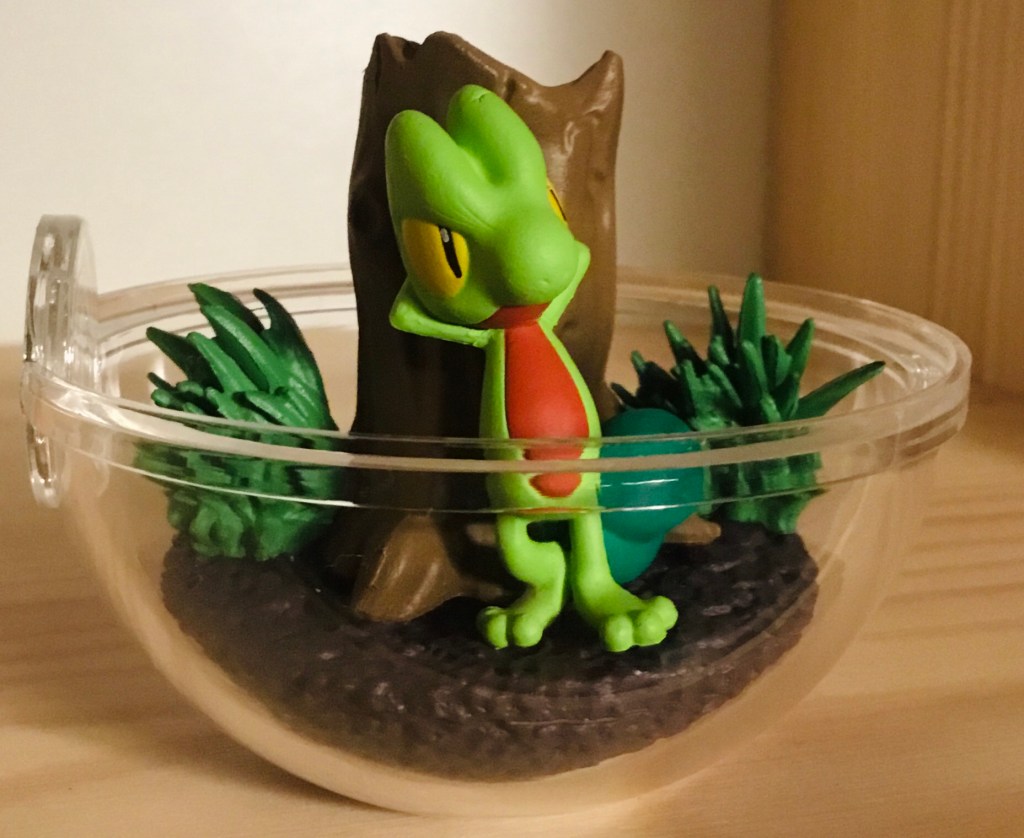 The next terrarium, featuring Kimori (Treecko), isn’t the most exciting, either. Because I skipped right over Ruby and Sapphire, I don’t really know much about him or any of the other starters. Nor do I have anything particularly interesting to say about the name; since the English combines tree and gecko, I’m guessing the Japanese is just combining 木 ki, tree, with ヤモリ yamori, gecko. Combine all this with another pretty boring background, and, well, let’s move on to the next.