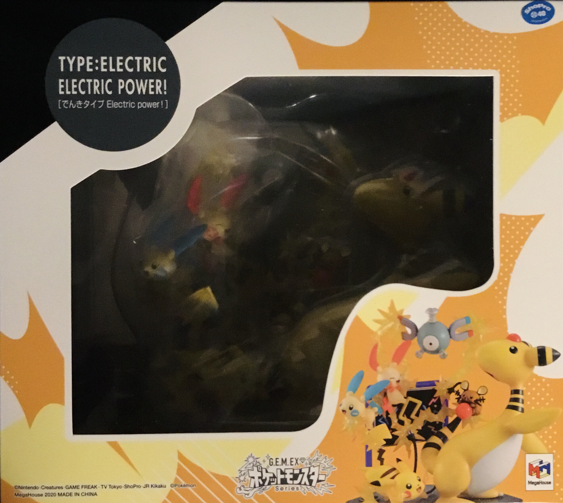 When I picked that figure up, filled as usual with 2020 despair and panic spending, I went ahead and preordered this Type:Electric Electric Power! figure — the next in that same line — and when it came in, it was even bigger than the ghosties. I’m starting to have the uneasy feeling that I’m going to need to locate room and money for every single type MegaHouse puts out one of these figures for (heaven help me when Water Type makes its appearance…or, oh god, can you imagine Steel?!) Let’s take a look!