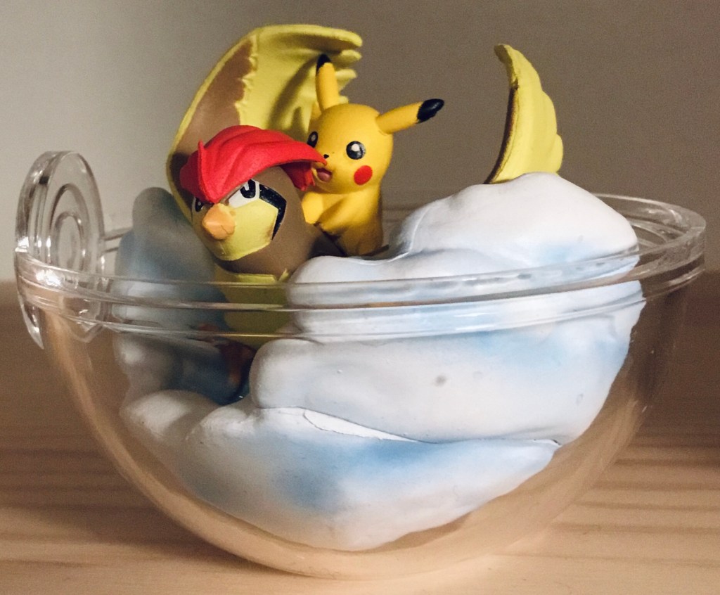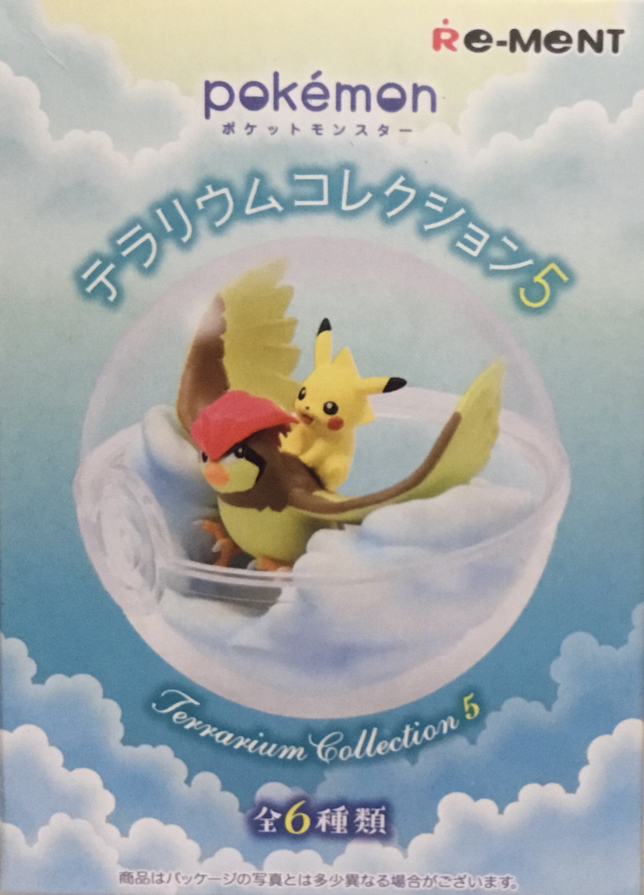If it’s not every single one of these collections that has Pikachu in it, it’s pretty close, and this time the setting is extra cute — he’s riding on Pigeon/Pidgeotto! We’ve had some imperfect experiences with these terrariums and large birdlike Pokemon, especially when we’ve got a cloud setup like here, but I thought this particular terrarium was really well pulled off. It’s like holding a little cloud in your hand with a couple of Pokemon in it. ^-^