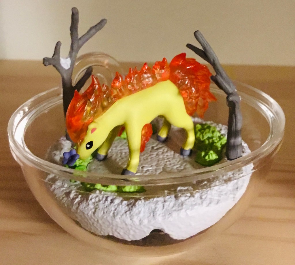 The sheer soul-charming cuteness of the last set makes this next one feel a little disappointing, though, for several reasons, including a pretty boring base that makes me worry that the bare trees are going to catch on fire, and the fact that I never really noticed Ponyta in my life in any significant way, and the fact that Galarian Ponyta is a million times better and has an amazing terrarium.