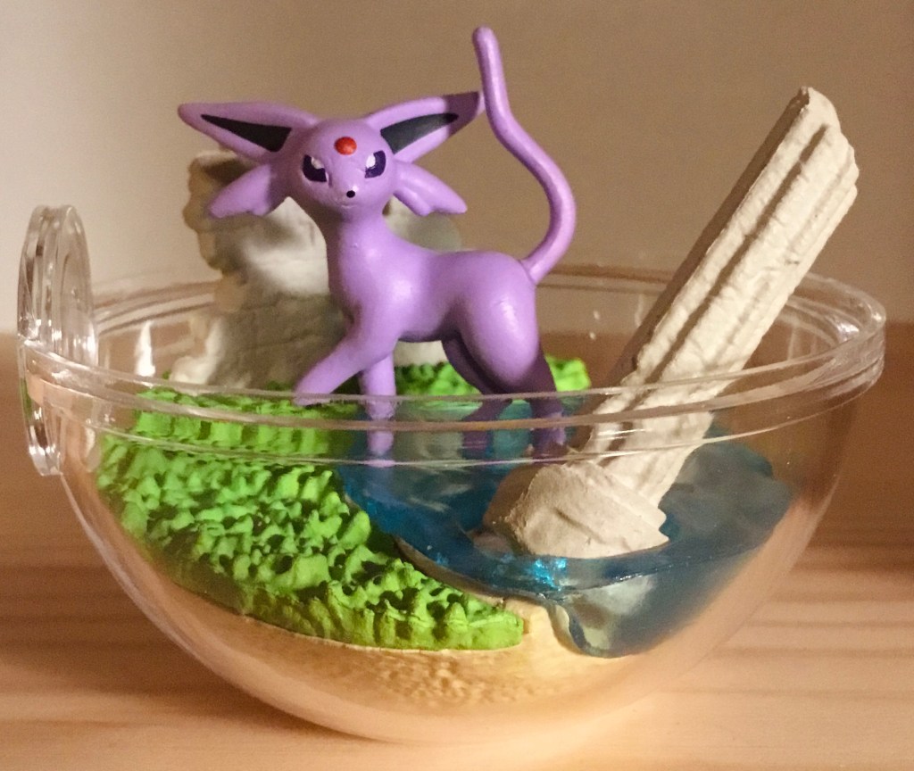 I don’t think I noticed when I ordered this collection just how much water is involved in these terrariums! I must admit I’m just intrigued with the setup of our last figure, featuring Eifii/Espeon. I just get the feeling I’ve walked in on them while some serious psychic shit is going down. I like the greenery and the ruins and — well — the whole thing, actually. The water doesn’t quite meet the land as would be ideal, but I think that’s within reasonable boundaries for candy toys.