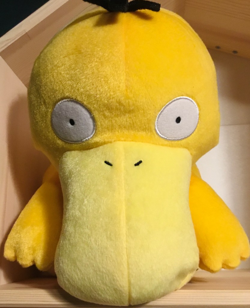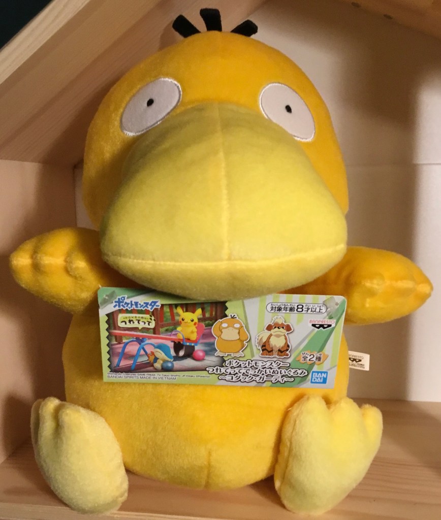 I’m not sure what his exact ranking would be — I definitely need to write about that sometime soon — but Psyduck is in my top ten Pokemon for sure, and I’ll never not try to win when one shows up on Toreba. Not only do they look especially emperiled and in need of saving when stuck inside a crane machine, but they’re also the favorite Pokemon of the hubs, who sleeps with me each night in a growing pile of Nyaasu and Psyduck due to my Toreba addiction. (Those poor plush — see why I try to get a photograph of them as soon as I can, before the properly loved ones end up all squished out of shape or stepped on by my feet?)