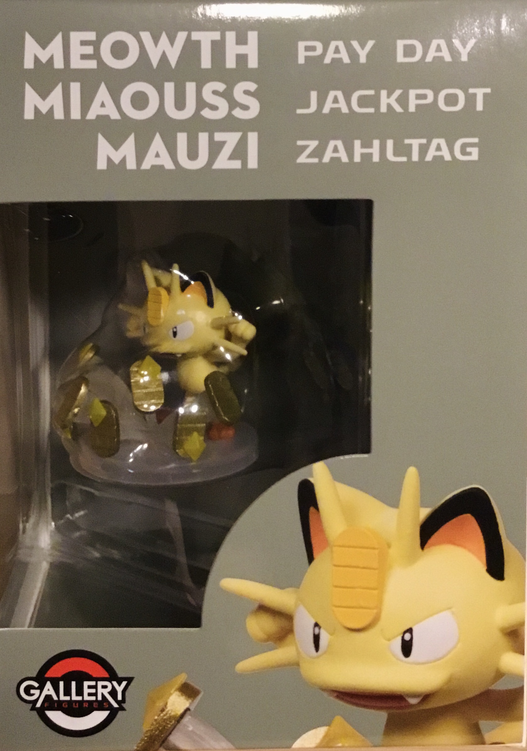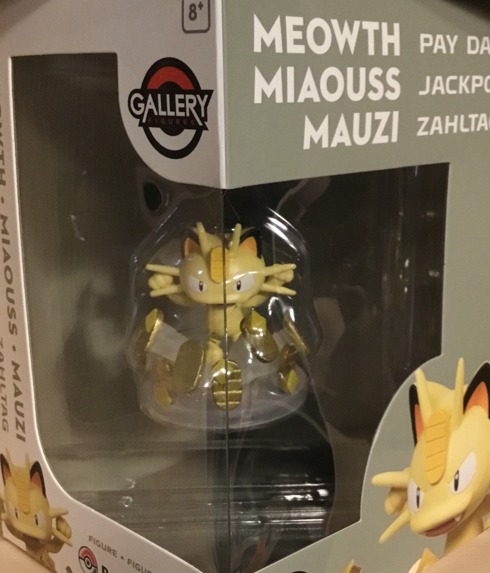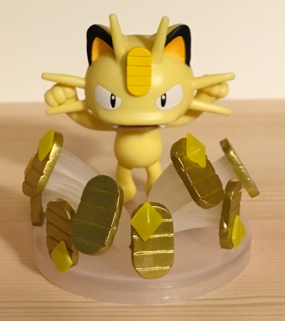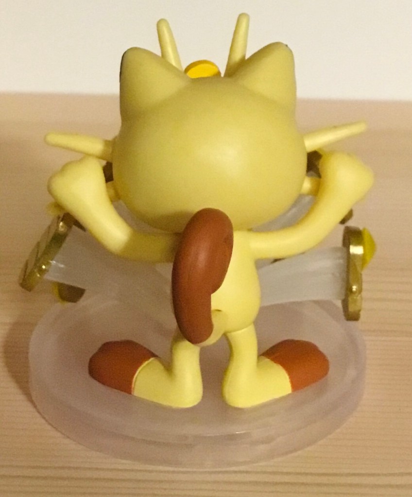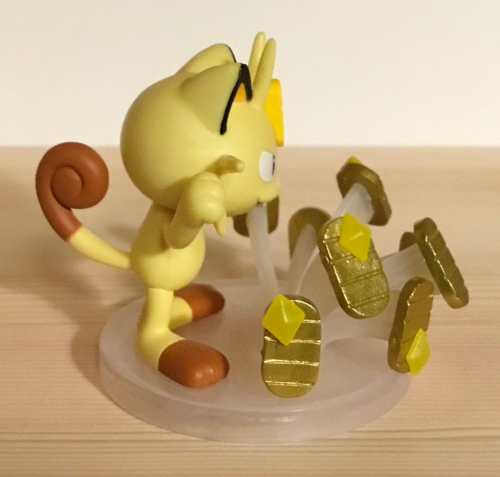 But this is way closer to a nice gachapon than a figure, and that means that the price tag of $15 is just. Way. Too. Much. Nyaasu as a Pokemon species doesn’t have all that much eye appeal to me by default (until we get to the Galar variant, of course) compared to other, flashier Pokemon, and the one here isn’t particularly cute or unique in any way. They just look kind of mean as opposed to badass, or whatever, and in the end, a mediocre Nyaasu plus some coins glued to thingies is only worth about half of the price.