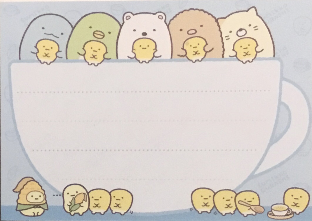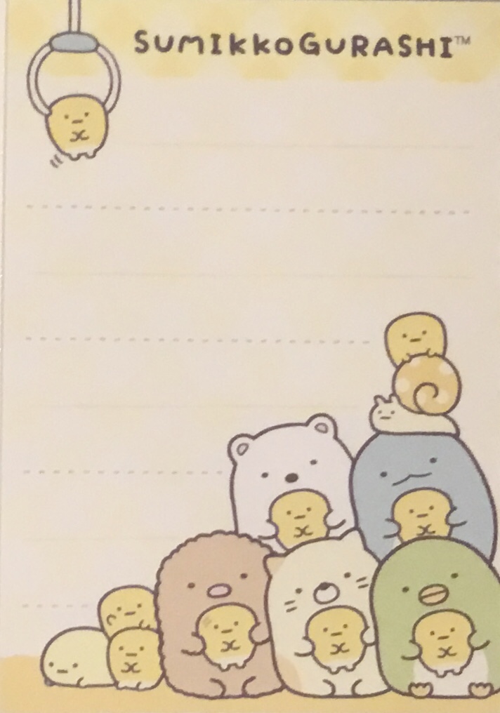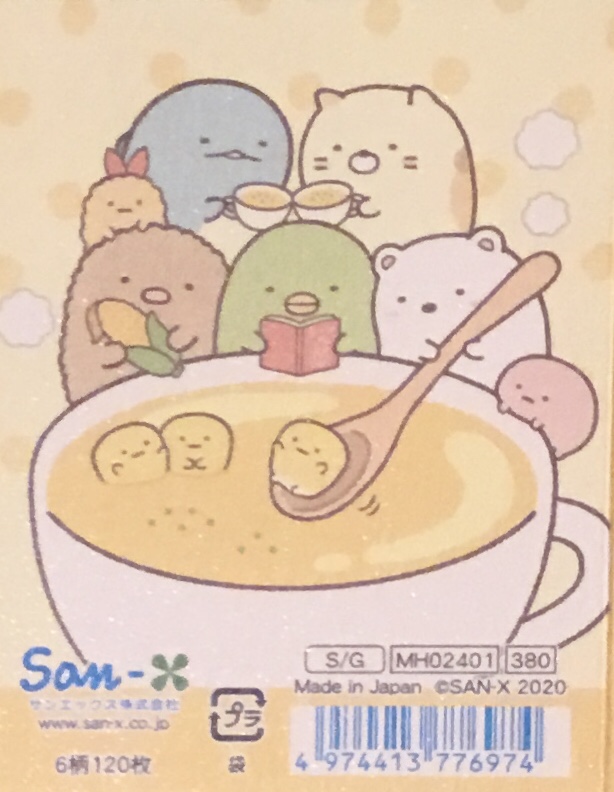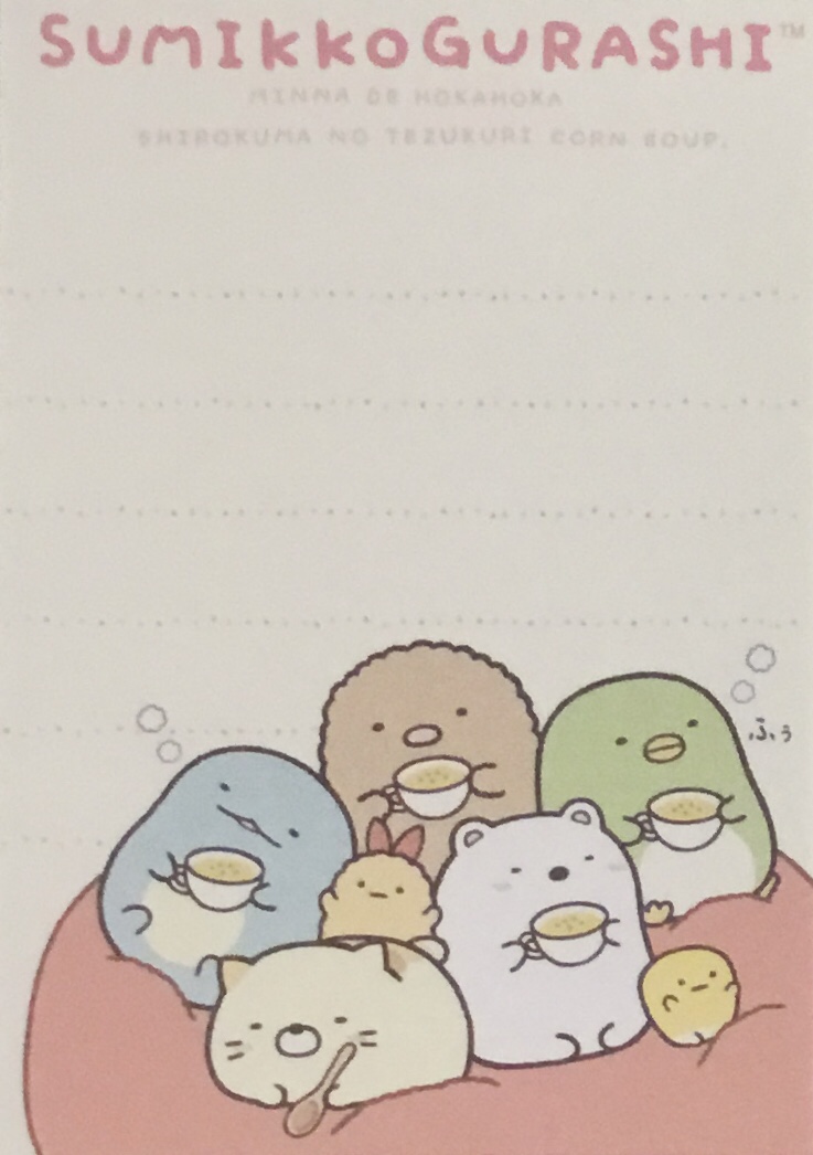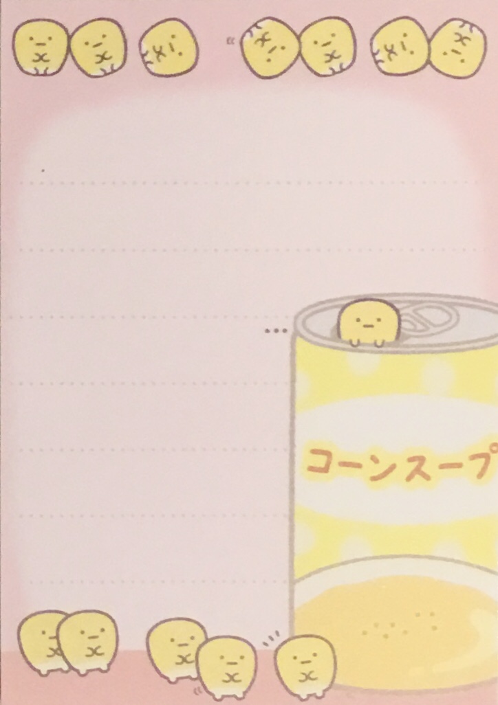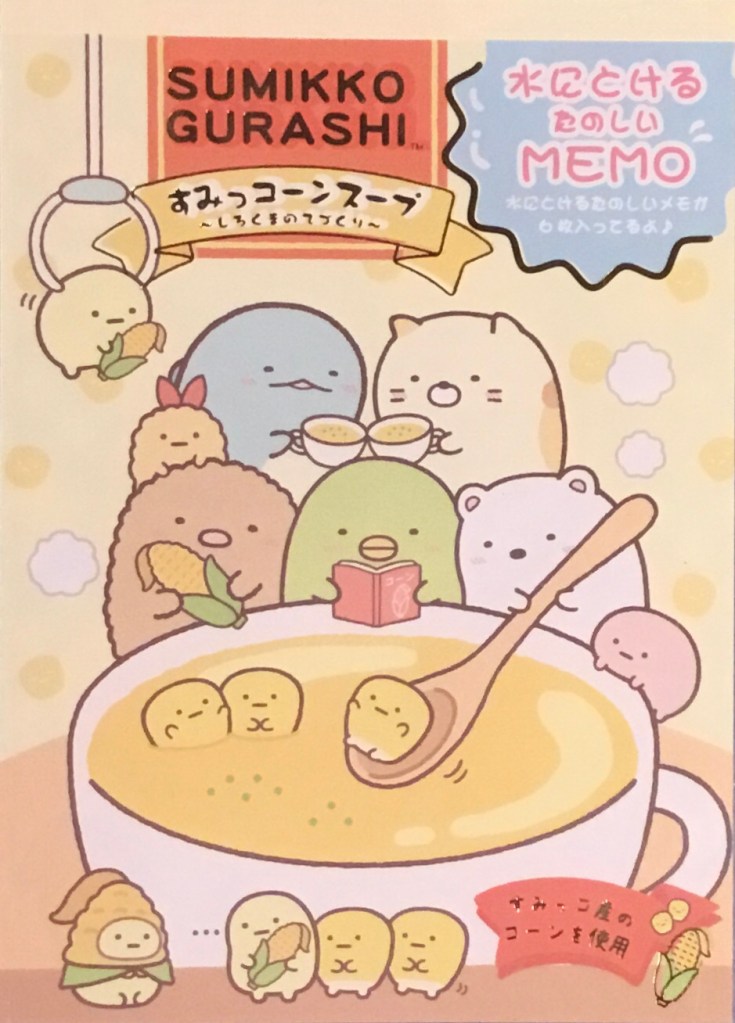 Hooray! I finally get a chance to talk about these items I had remaining from the recent and amazing Shirokuma’s Nice and Warm Corn Soup collection from Sumikko Gurashi (see here for the plushies). I’ve got three types of items today, the first of which is one of those adorable San-x memo pads.
