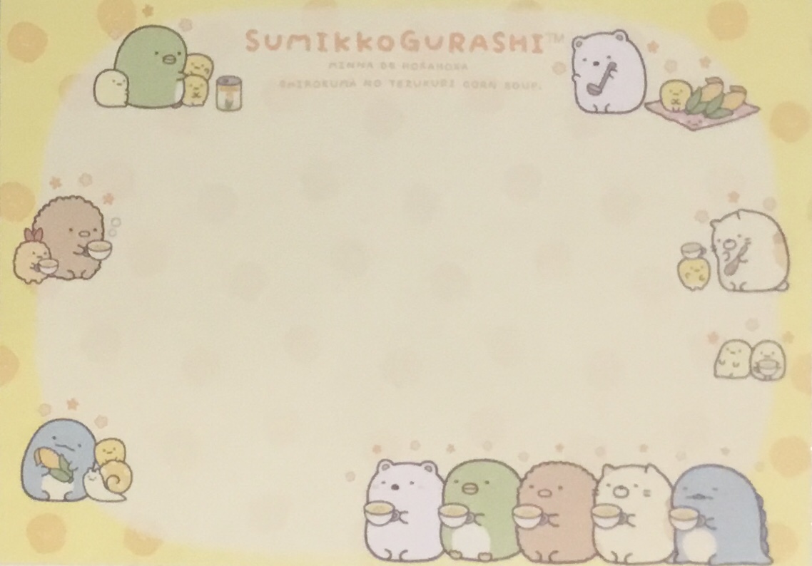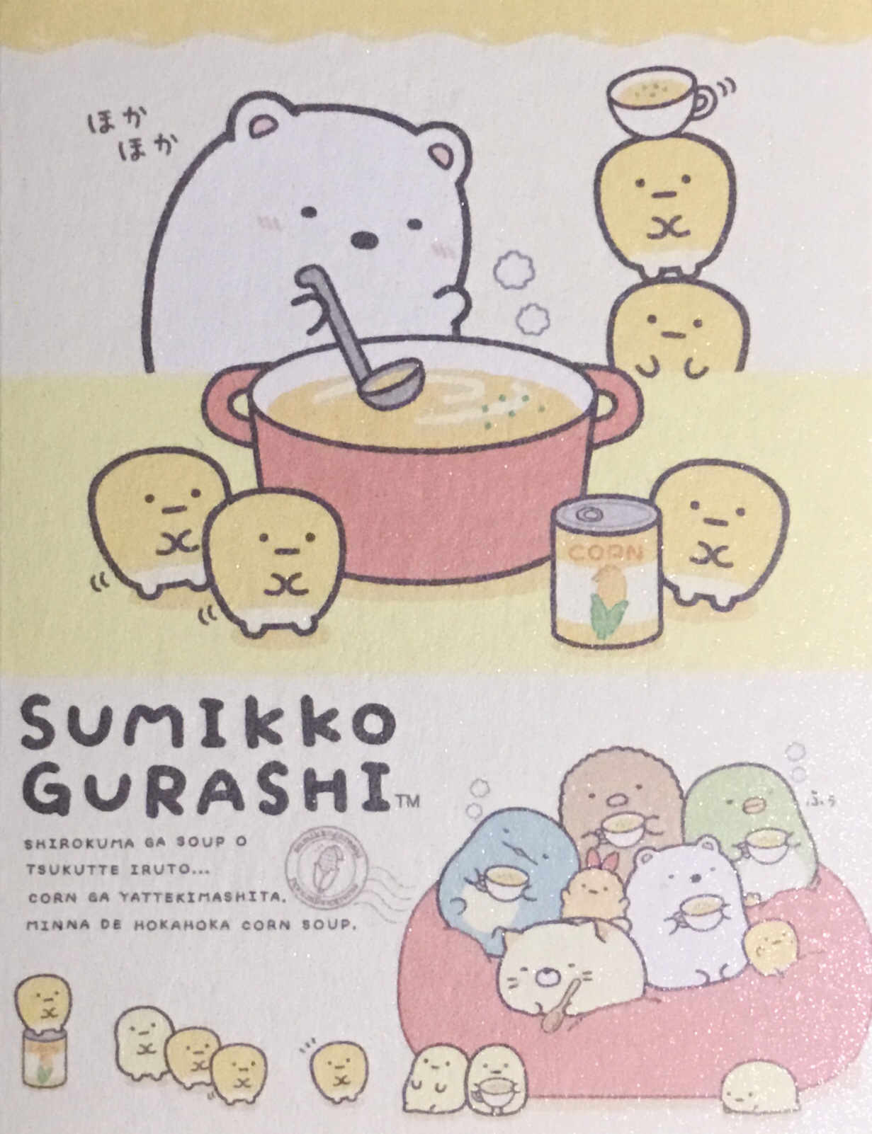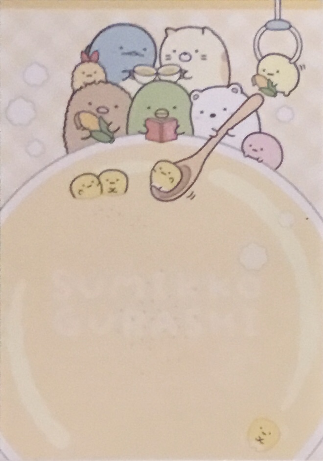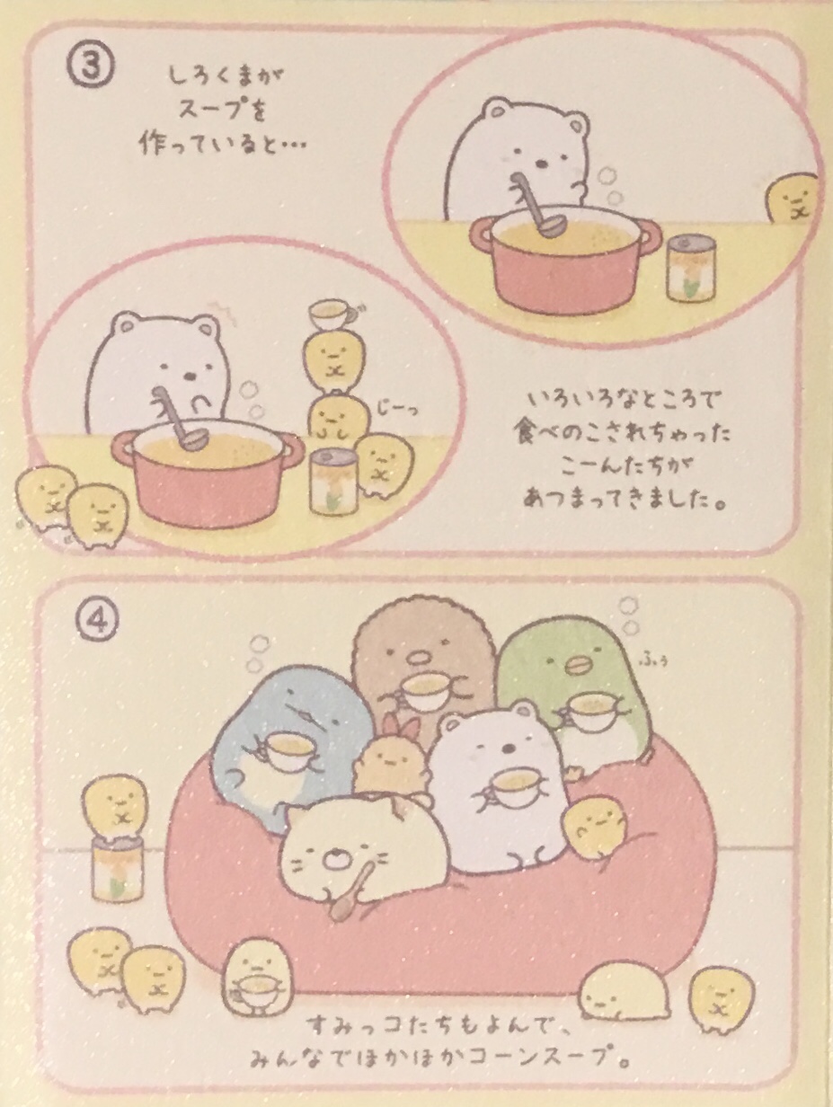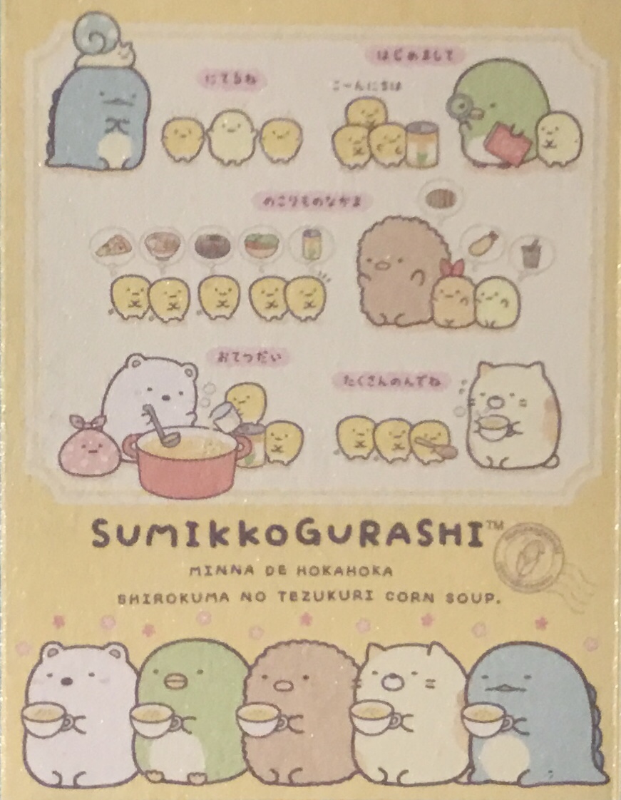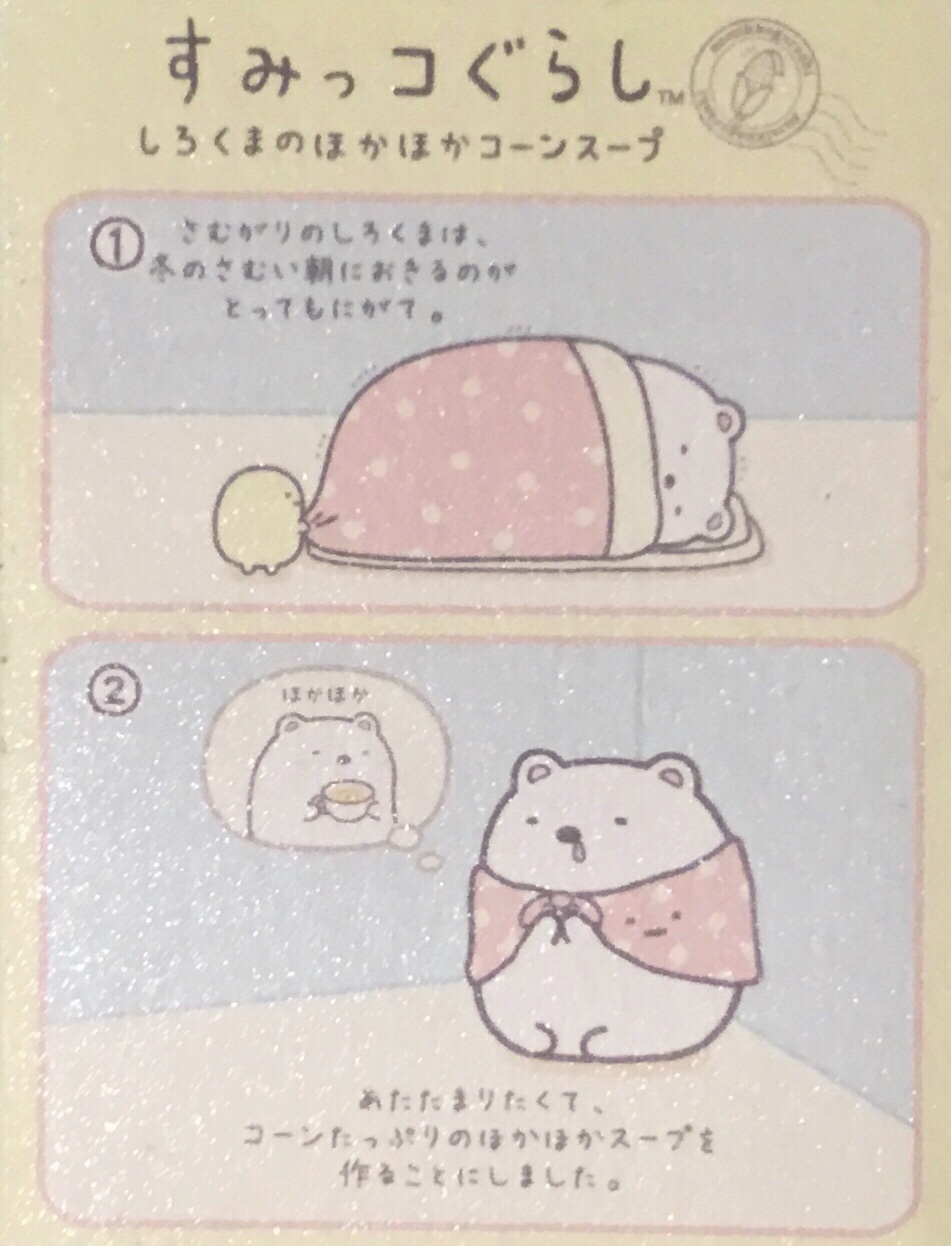 Here’s the story of how all this came to be (the title says Sumikko Gurashi Shirokuma’s Nice and Warm Corn Soup):