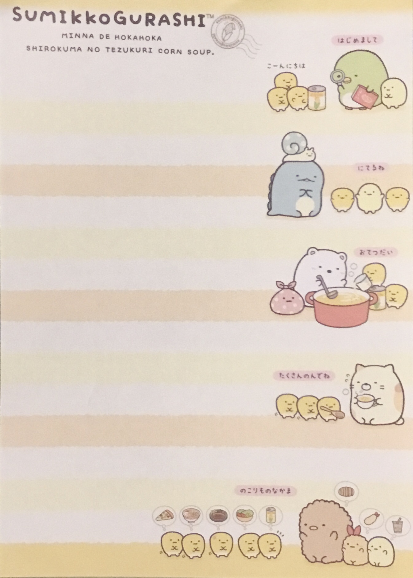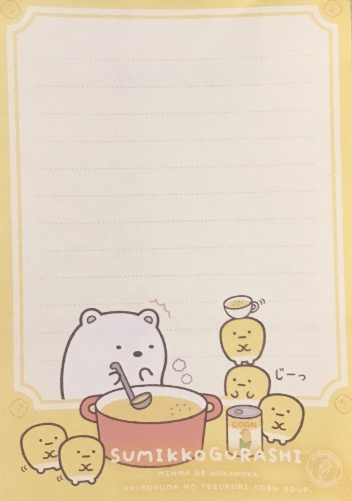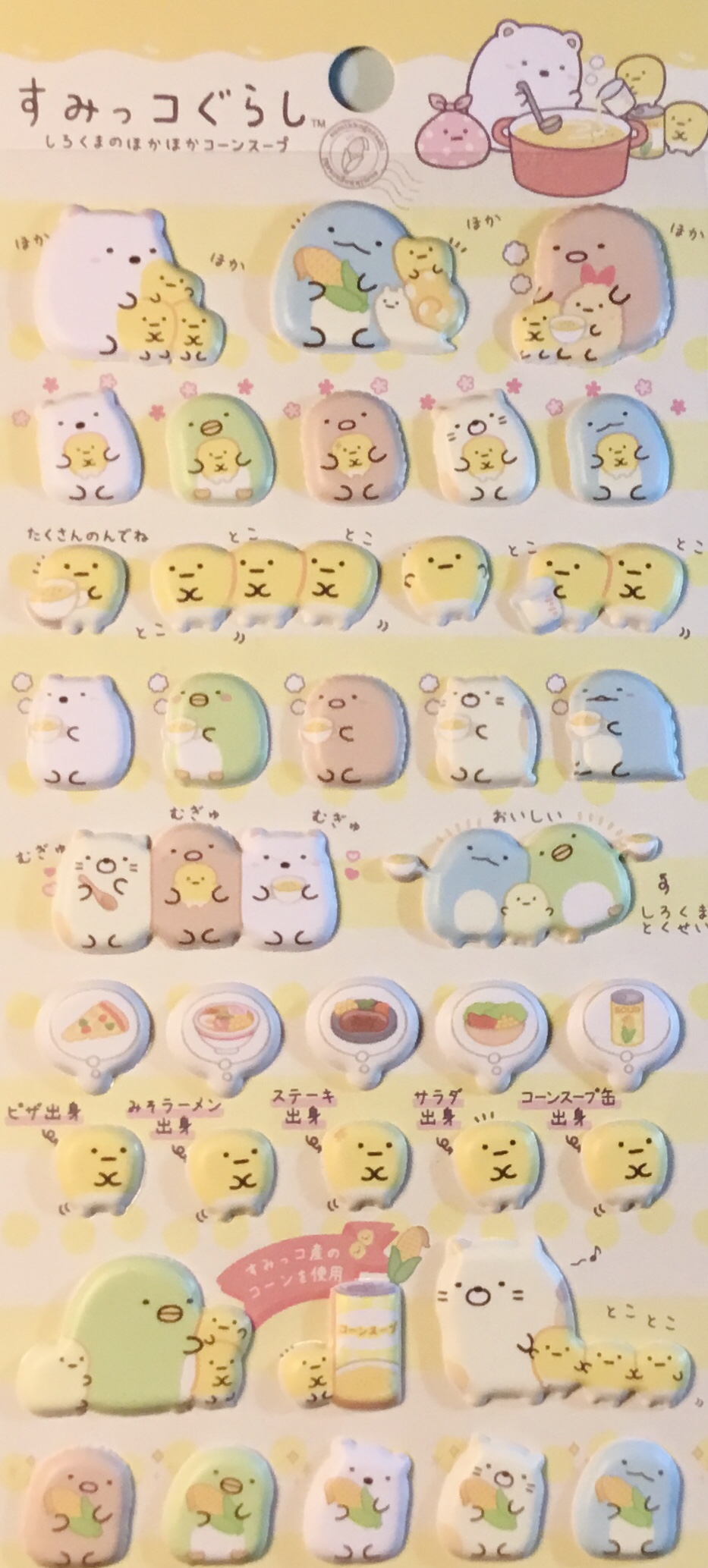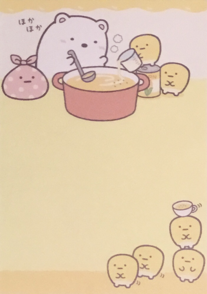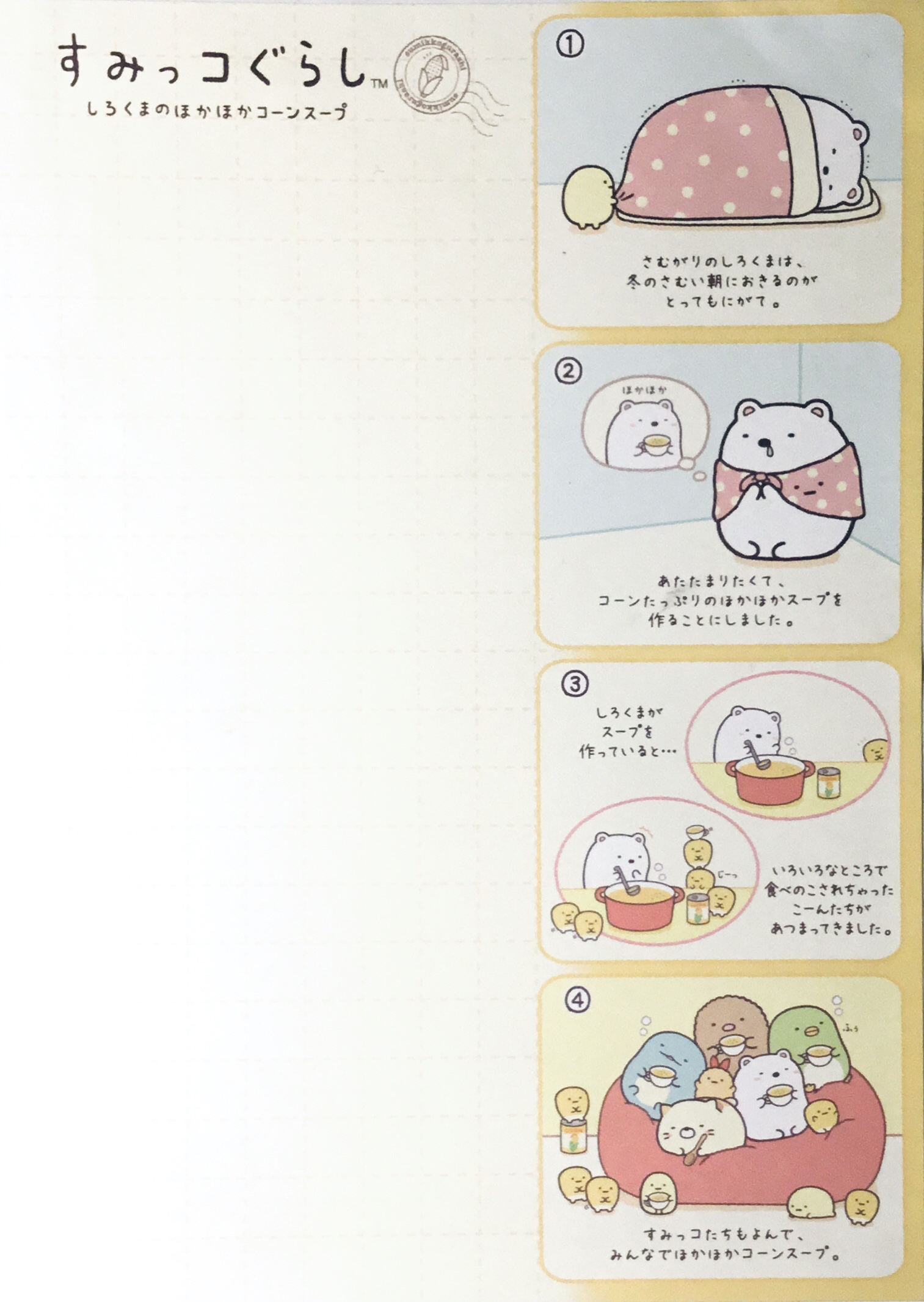 Here’s the story of how all this came to be (the title says Sumikko Gurashi Shirokuma’s Nice and Warm Corn Soup):