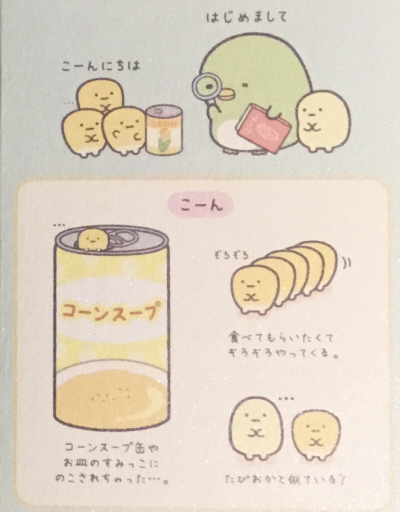 Below left is the rundown of where all the various Corns came from, and on the right (below Penguin meeting them and another adorable corn nichi wa, as above), there are some facts. Under the can, it says the Corns were left behind on a plate from a can of corn soup, and on the right it has them toddling up hoping to be eaten and, below that, speculating on how much Corn looks like Tapioca.